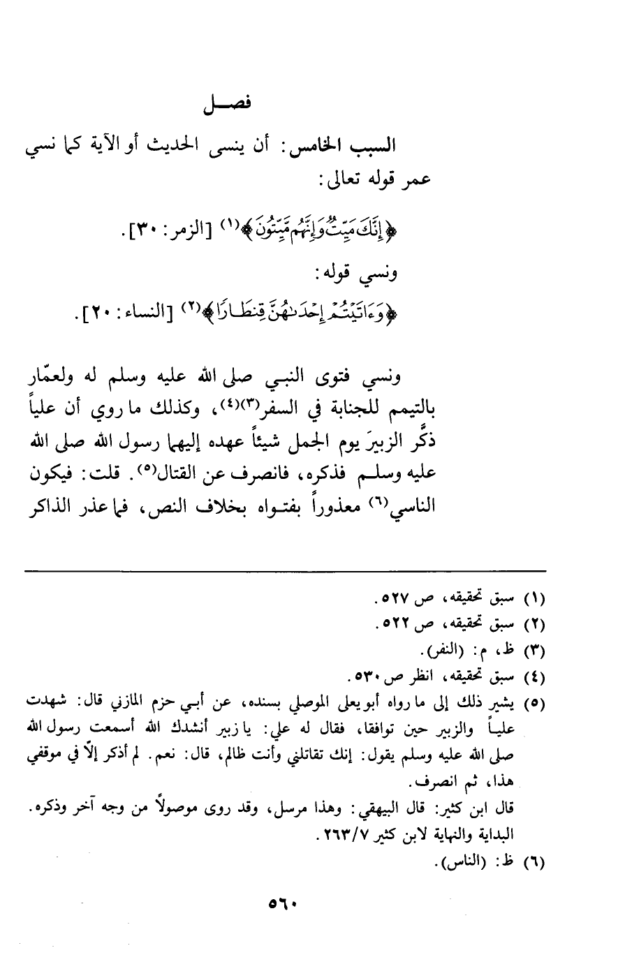 السبب الخامس: أن ينسى الحديث أو الآية كما نسي عمر قوله تعالى {إِنَّكَ مَيِّتٌ وَإِنَّهُمْ مَيِّتُونَ} [الزمر30] ونسي قوله {وَآتَيْتُمْ إِحْدَاهُنَّ قِنْطَاراً} [النساء20] ونسي فتوى النبي له ولعمار بالتيمم للجنابة في السفر وكذلك ما روي أن عليا ذكر الزبير يوم الجمل شيئا عهده إليهما رسول الله صلى الله عليه وسلم فذكره فانصرف عن القتال قلت فيكون الناسي معذورا بفتواه بخلاف النص فما عذر الذاكر