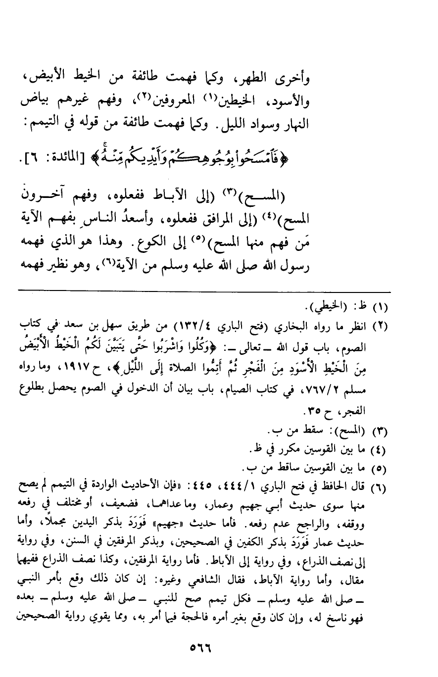 وأخرى الطهر وكما فهمت طائفة من الخيط الأبيض والأسود الخيطين المعروفين وفهم غيرهم بياض النهار وسواد الليل وكما فهمت طائفة من قوله في التيمم {فَامْسَحُوا بِوُجُوهِكُمْ وَأَيْدِيكُمْ مِنْهُ} [المائدة6] المسح إلى الآباط ففعلوه وفهم آخرون المسح إلى المرافق ففعلوه وأسعد الناس بفهم الآية من فهم منها المسح إلى الكوع وهذا هو الذي فهمه رسول الله صلى الله عليه وسلم من الآية وهو نظير فهمه