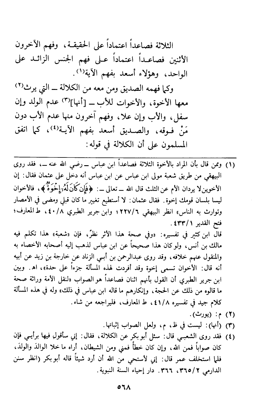 وكما فهم الصديق ومن معه من الكلالة التي يرث معها الإخوة والأخوات للأب أنها عدم الولد وإن سفل والأب وإن علا وفهم آخرون منها عدم الأب دون من فوقه والصديق أسعد بفهم الآية كما اتفق المسلمون على أن الكلالة في قوله: