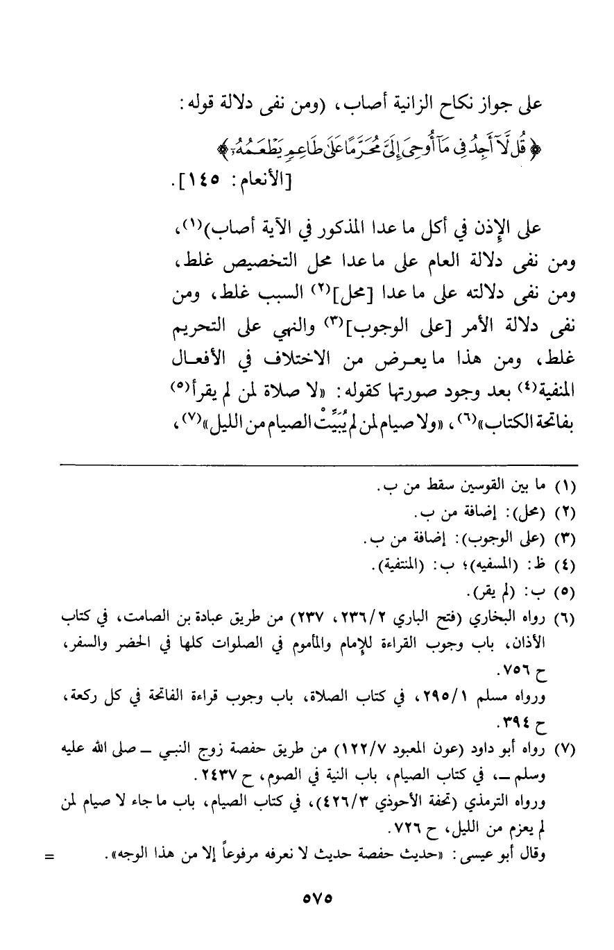 على جواز نكاح الزانية أصاب ومن نفى دلالة قوله {قُلْ لا أَجِدُ فِي مَا أُوحِيَ إِلَيَّ مُحَرَّماً عَلَى طَاعِمٍ يَطْعَمُهُ} [الأنعام145] على الإذن في أكل ما عدا المذكور في الآية أصاب ومن نفى دلالة العام على ما عدا محل التخصيص غلط ومن نفى دلالته على ما عدا محل السبب غلط ومن نفى دلالة الأمر على الوجوب والنهي على التحريم غلط ومن هذا ما يعرض من الاختلاف في الأفعال المنفية بعد وجود صورتها كقوله "لا صلاة لمن لم يقرأ بفاتحة الكتاب " "ولا صيام لمن لم يبيت الصيام من الليل"