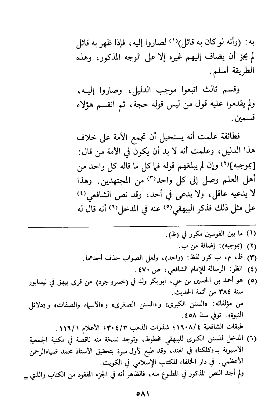 فطائفة علمت أنه يستحيل أن تجمع الأمة على خلاف هذا الدليل وعلمت أنه لا بد أن يكون في الأمة من قال بموجبه وإن لم يبلغهم قوله فما كل ما قاله كل واحد من أهل العلم وصل إلى كل واحد من المجتهدين وهذا لا يدعيه عاقل ولا يدعي في أحد وقد نص الشافعي على مثل ذلك فذكر البيهقي عنه في المدخل أنه قال له