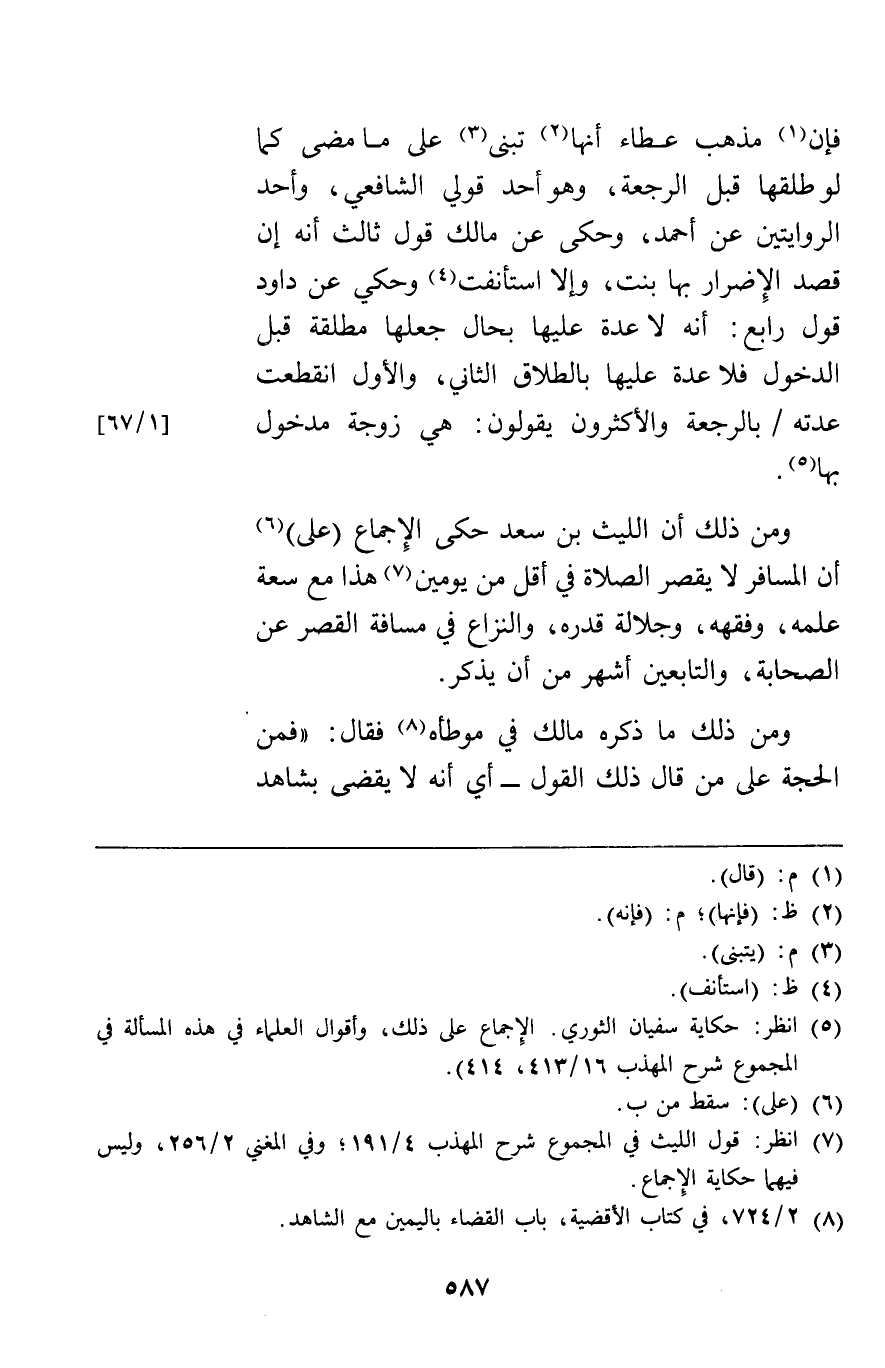 ومن ذلك أن الليث بن سعد حكى الإجماع على أن المسافر لا يقصر الصلاة في اقل من يومين هذا مع سعة علمه وفقهه وجلالة قدره والنزاع في مسافة القصر عن الصحابة والتابعين أشهر من أن يذكر.