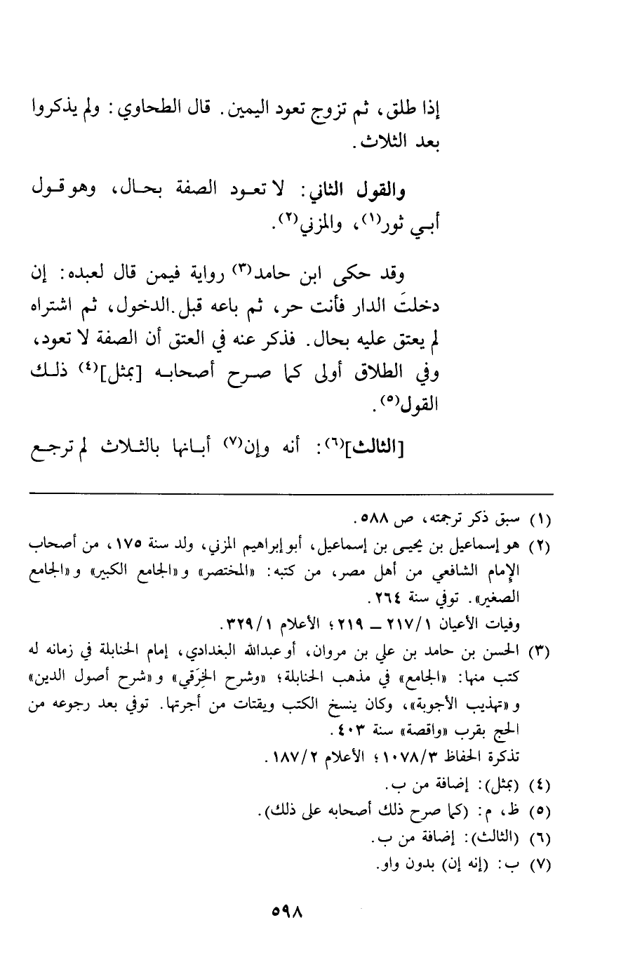 والقول الثاني: لا تعود الصفة بحال وهو قول أبي ثور والمزني وقد حكى ابن حامد رواية فيمن قال لعبده إن دخلت الدار فأنت حر ثم باعه قبل الدخول ثم اشتراه لم يعتق عليه بحال فذكر عنه في العتق أن الصفة لا تعود وفي الطلاق أولى كما صرح أصحابه بمثل ذلك القول.