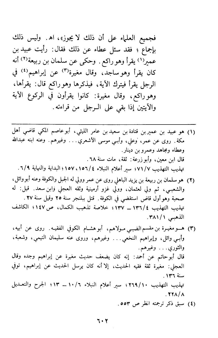 فجميع العلماء على أن ذلك لا يجوز اه وليس ذلك بإجماع فقد سئل عطاء عن ذلك فقال رأيت عبيد بن عمير يقرأوهو راكع وحكي عن سلمان بن ربيعة أنه كان يقرأوهو ساجد وقال مغيرة عن إبراهيم في الرجل يقرأ فيترك الآية فيذكرها وهو راكع قال يقرأها وهو راكع وقال مغيرة كانوا يقرأون في الركوع الآية والآيتين إذا بقي على الرجل من قراءته.