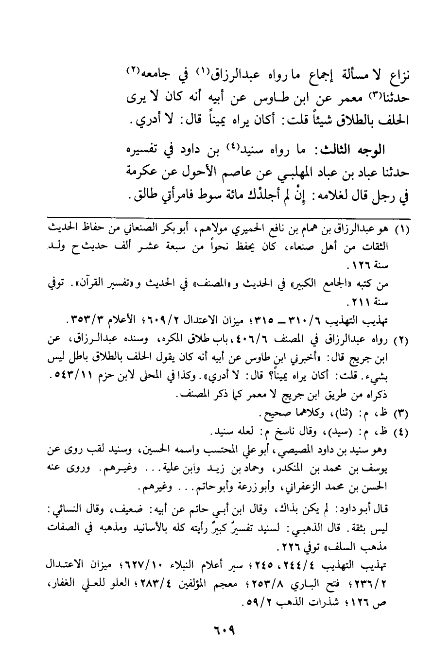 الوجه الثالث: ما رواه سنيد بن داود في تفسيره حدثنا عباد بن عباد المهلبي عن عاصم الأحول عن عكرمة في رجل قال لغلامه إن لم أجلدك مائة سوط فامرأتي طالق.