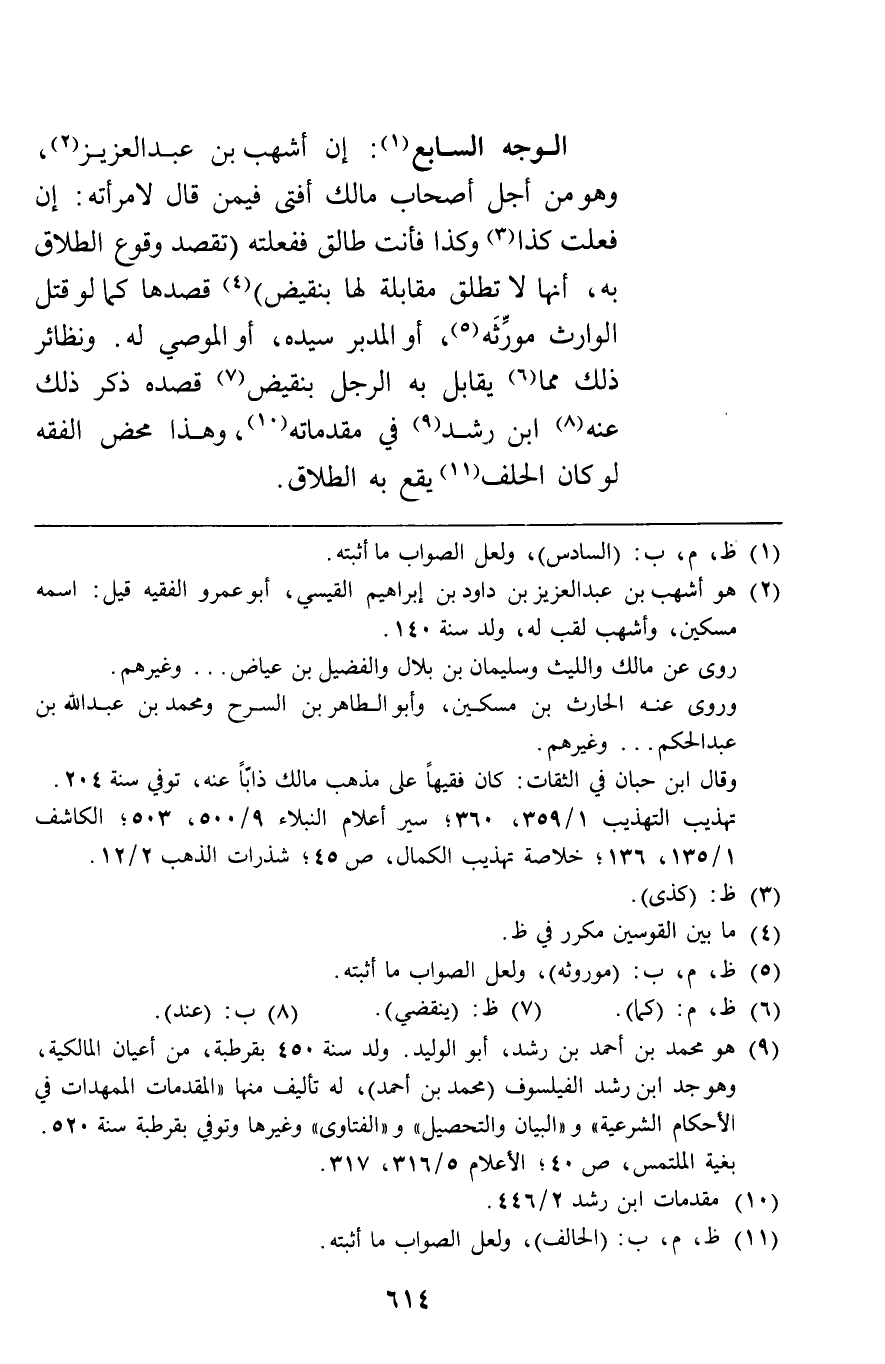 الوجه السابع: إن أشهب بن عبد العزيز وهو من أجل أصحاب مالك أفتى فيمن قال لإمرأته إن فعلت كذا وكذا فأنت طالق ففعلته تقصد وقوع الطلاق به أنها لا تطلق مقابلة لها بنقيض قصدها كما لو قتل الوارث مورثه أو المدبر سيده أو الموصي له ونظائر ذلك مما يقابل به الرجل بنقيض قصده ذكر ذلك عنه ابن رشد في مقدماته وهذا محض الفقه لو كان الحلف يقع به الطلاق.
