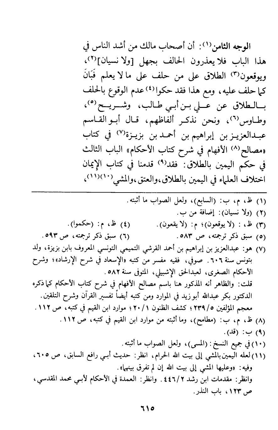 الوجه الثامن: أن أصحاب مالك من أشد الناس في هذا الباب فلا يعذرون الحالف بجهل ولا نسيان ويوقعون الطلاق على من حلف على مالا يعلم فبان كما حلف عليه ومع هذا فقد حكوا عدم الوقوع بالحلف بالطلاق عن علي بن أبي طالب وشريح وطاوس ونحن نذكر ألفاظهم قال أبو القاسم عبد العزيز بن إبراهيم بن أحمد بن بزيزة في كتاب مصالح الأفهام في شرح كتاب الأحكام الباب الثالث في حكم اليمين بالطلاق فقد قدمنا في كتاب الإيمان اختلاف العلماء في اليمين بالطلاق والعتق والمشي