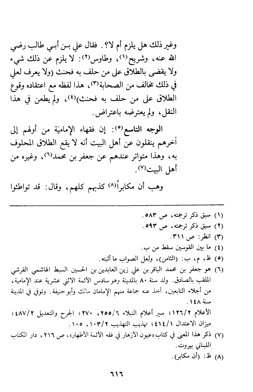 الوجه التاسع: إن فقهاء الإمامية من أولهم إلى آخرهم ينقلون عن أهل البيت أنه لا يقع الطلاق المحلوف به وهذا متواتر عندهم عن جعفر بن محمد وغيره من أهل البيت.