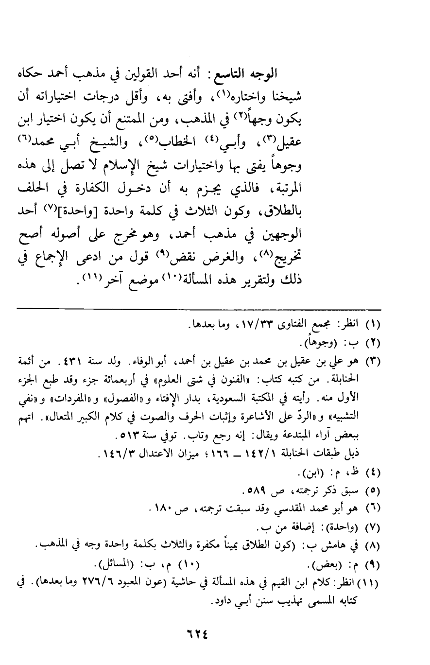 الوجه التاسع: أنه أحد القولين في مذهب أحمد حكاه شيخنا واختاره وأفتى به وأقل درجات اختياراته أن يكون وجها في المذهب ومن الممتنع أن يكون اختيار ابن عقيل وأبي الخطاب والشيخ أبي محمد وجوها يفتى بها واختيارات شيخ الإسلام لا تصل إلى هذه المرتبة فالذي يجزم به أن دخول الكفارة في الحلف بالطلاق وكون الثلاث في كلمة واحدة واحدة أحد الوجهين في مذهب أحمد وهو مخرج على أصوله أصح تخريج والغرض نقض قول من ادعى الإجماع في ذلك ولتقرير هذه المسألة موضع آخر.