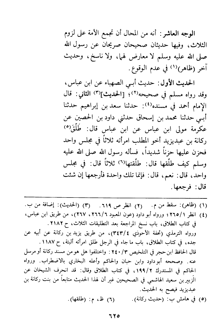 الوجه العاشر: أنه من المحال أن تجمع الأمة على لزوم الثلاث وفيها حديثان صحيحان صريحان عن رسول الله صلى الله عليه وسلم لا معارض لهما ولا ناسخ وحديث آخر ظاهر في عدم الوقوع.