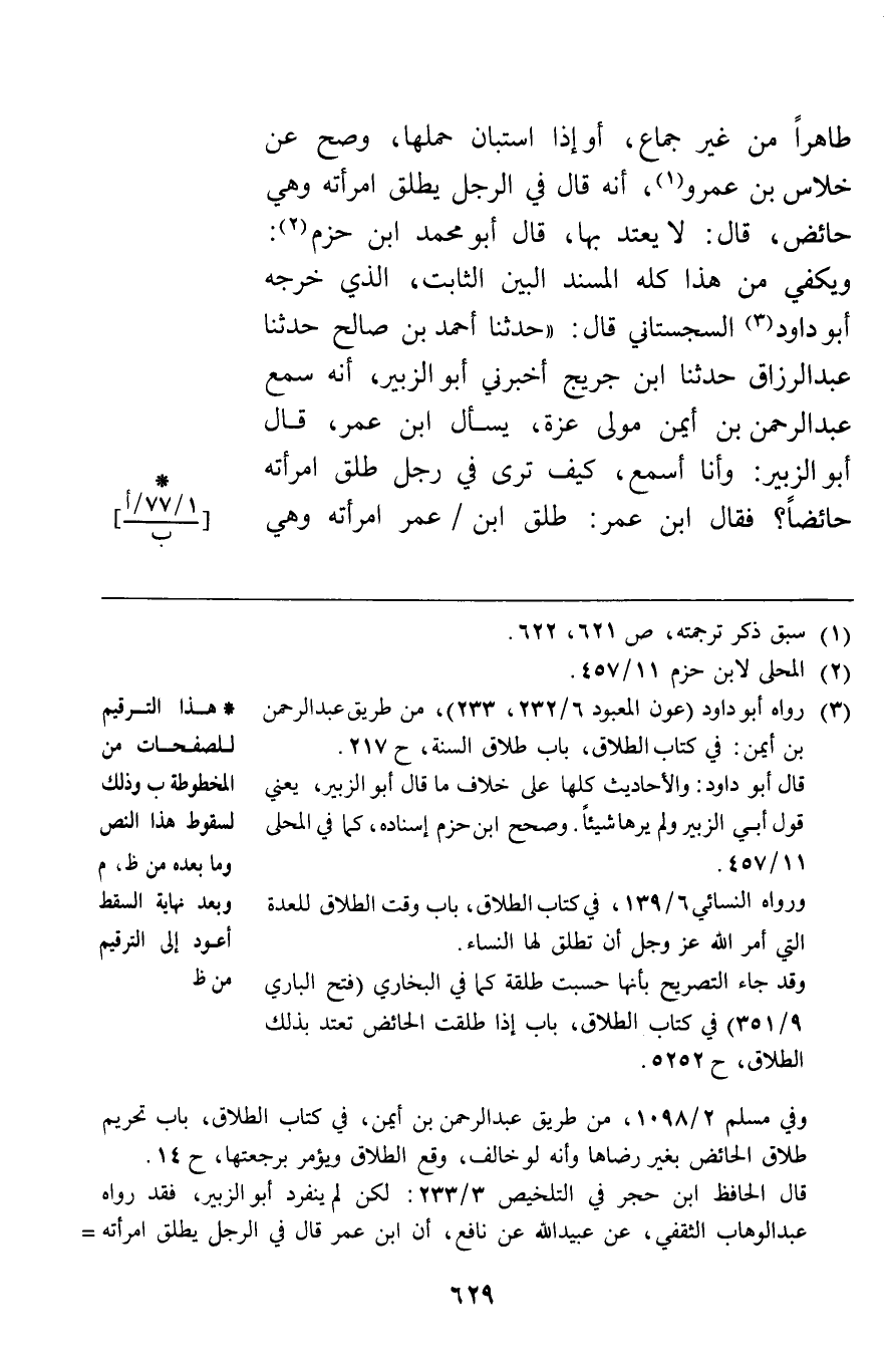 طاهرا من غير جماع أو إذا استبان حملها وصح عن خلاس بن عمرو أنه قال في الرجل يطلق امرأته وهي حائض قال لا يعتد بها قال أبو محمد بن حزم ويكفي من هذا كله المسند البين الثابت الذي خرجه أبو داود السجستاني قال حدثنا أحمد بن صالح حدثنا عبد الرزاق حدثنا ابن جريج أخبرني أبو الزبير أنه سمع عبد الرحمن بن أيمن مولى عزة يسأل ابن عمر قال أبو الزبير وأنا أسمع كيف ترى في رجل طلق امرأته حائضا فقال ابن عمر طلق ابن عمر امرأته وهي