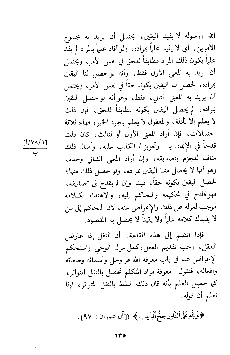 فإذا انضم إلى هذه المقدمة أن النقل إذا عارض العقل وجب تقديم العقل كمل عزل الوحي واستحكم الإعراض عنه في باب معرفة الله عز وجل واسمائه وصفاته وأفعاله فنقول معرفة مراد المتكلم تحصل بالنقل المتواتر كما حصل العلم بأنه قال ذلك اللفظ بالنقل المتواتر فإنا نعلم أن قوله {لِلَّهِ عَلَى النَّاسِ حِجُّ الْبَيْتِ} [آل عمران97]
