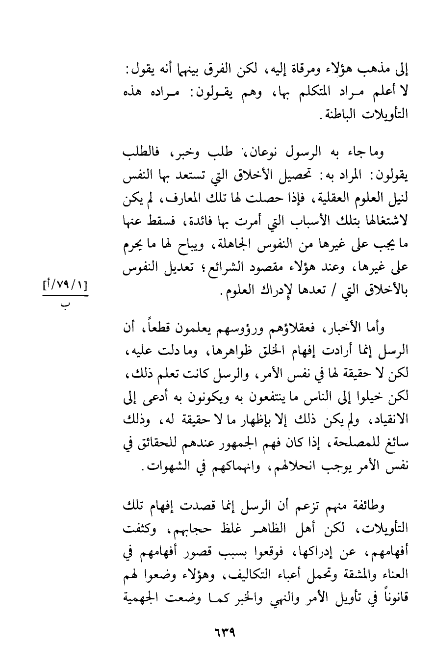وما جاء به الرسول نوعان طلب وخبر فالطلب يقولون المراد به تحصيل الأخلاق التي تستعد بها النفس لنيل العلوم العقلية فإذا حصلت لها تلك المعارف لم يكن لاشتغالها بتلك الأسباب التي أمرت بها فائدة فسقط عنها ما يجب على غيرها من النفوس الجاهلة ويباح لها ما يحرم على غيرها وعند هؤلاء مقصود الشرائع تعديل النفوس بالأخلاق التي تعدها لإدراك العلوم.