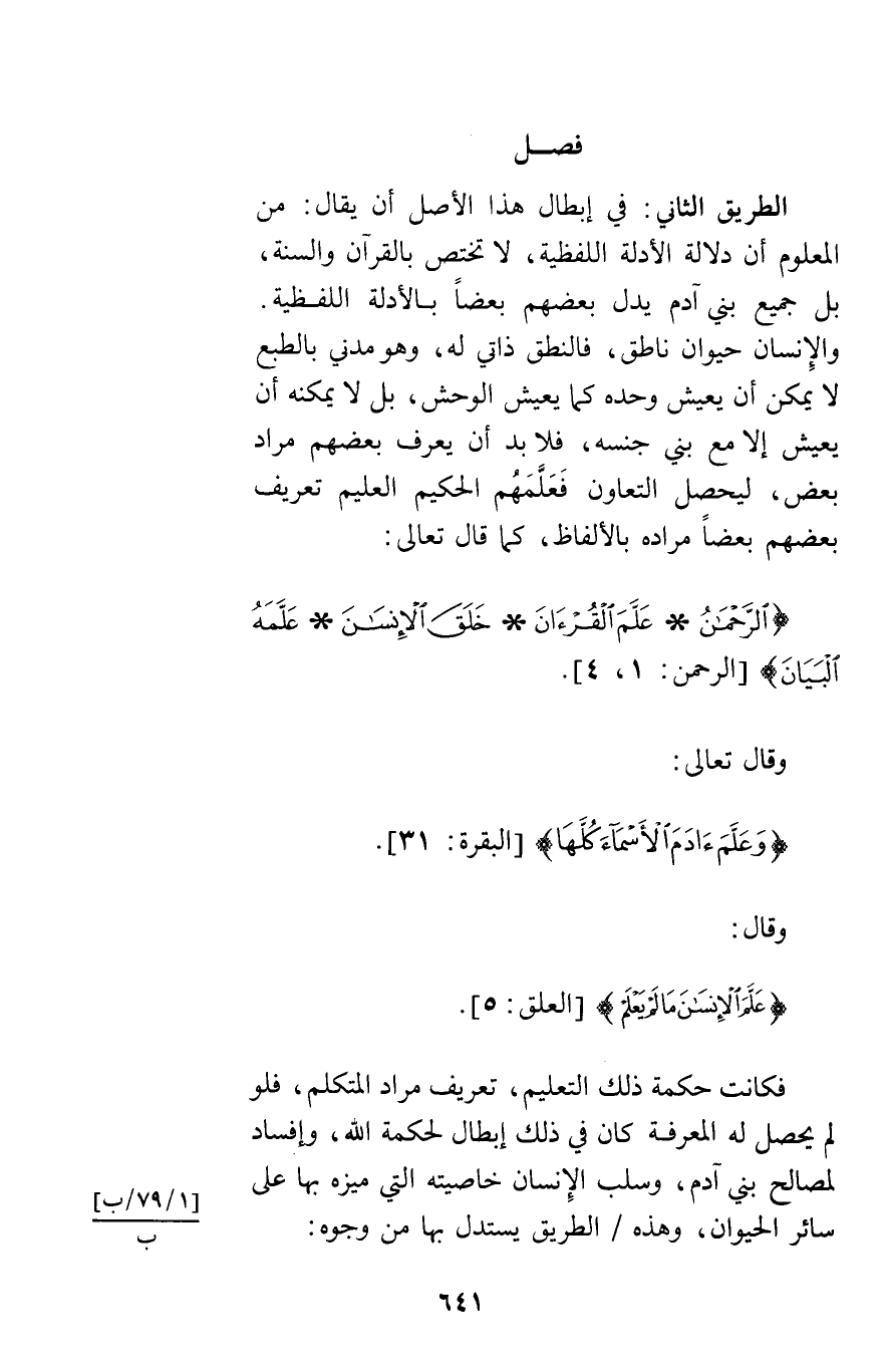 الطريق الثاني: في إبطال هذا الأصل أن يقال من المعلوم أن دلالة الأدلة اللفظية لا تختص بالقرآن والسنة بل جميع بني آدم يدل بعضهم بعضا بالأدلة اللفظية والإنسان حيوان ناطق فالنطق ذاتي له وهو مدني بالطبع لا يمكن أن يعيش وحده كما يعيش الوحش بل لا يمكنه أن يعيش إلا مع بني جنسه فلا بد أن يعرف بعضهم مراد بعض ليحصل التعاون فعلمهم الحكيم العليم تعريف بعضهم بعضا مراده بالألفاظ كما قال تعالى {الرَّحْمَنُ عَلَّمَ الْقُرْآنَ خَلَقَ الْأِنْسَانَ عَلَّمَهُ الْبَيَانَ} [الرحمن4 , 1] وقال تعالى {وَعَلَّمَ آدَمَ الأَسْمَاءَ كُلَّهَا} [البقرة31] وقال {عَلَّمَ الأِنْسَانَ مَا لَمْ يَعْلَمْ} [العلق5] فكانت حكمة ذلك التعليم تعريف مراد المتكلم فلو لم يحصل له المعرفة كان في ذلك إبطال لحكمة الله وإفساد لمصالح بني آدم وسلب الإنسان خاصيته التي ميزه بها على سائر الحيوان وهذه الطريق يستدل بها من وجوه