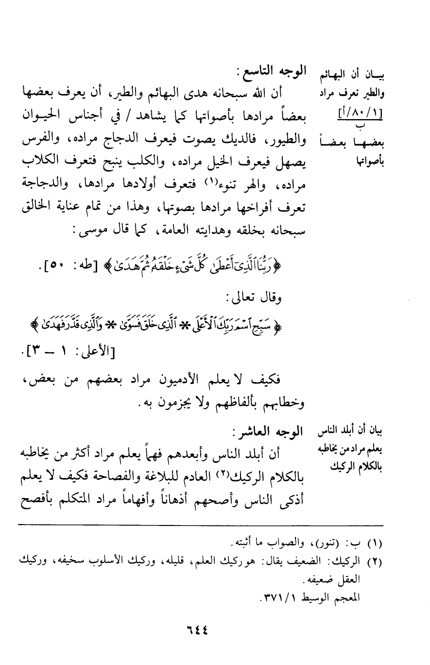 الوجه التاسع: أن الله سبحانه هدى البهائم والطير أن يعرف بعضها بعضا مرادها بأصواتها كما يشاهد في أجناس الحيوان والطيور فالديك يصوت فيعرف الدجاج مراده والفرس يصهل فيعرف الخيل مراده والكلب ينبح فتعرف الكلاب مراده والهر تنوء فتعرف أولادها مرادها والدجاجة تعرف أفراخها مرادها بصوتها وهذا من تمام عناية الخالق سبحانه بخلقه وهدايته العامة كما قال موسى: {قَالَ رَبُّنَا الَّذِي أَعْطَى كُلَّ شَيْءٍ خَلْقَهُ ثُمَّ هَدَى} [طه50] وقال تعالى {سَبِّحِ اسْمَ رَبِّكَ الْأَعْلَى الَّذِي خَلَقَ فَسَوَّى وَالَّذِي قَدَّرَ فَهَدَى} [الأعلى3-1]