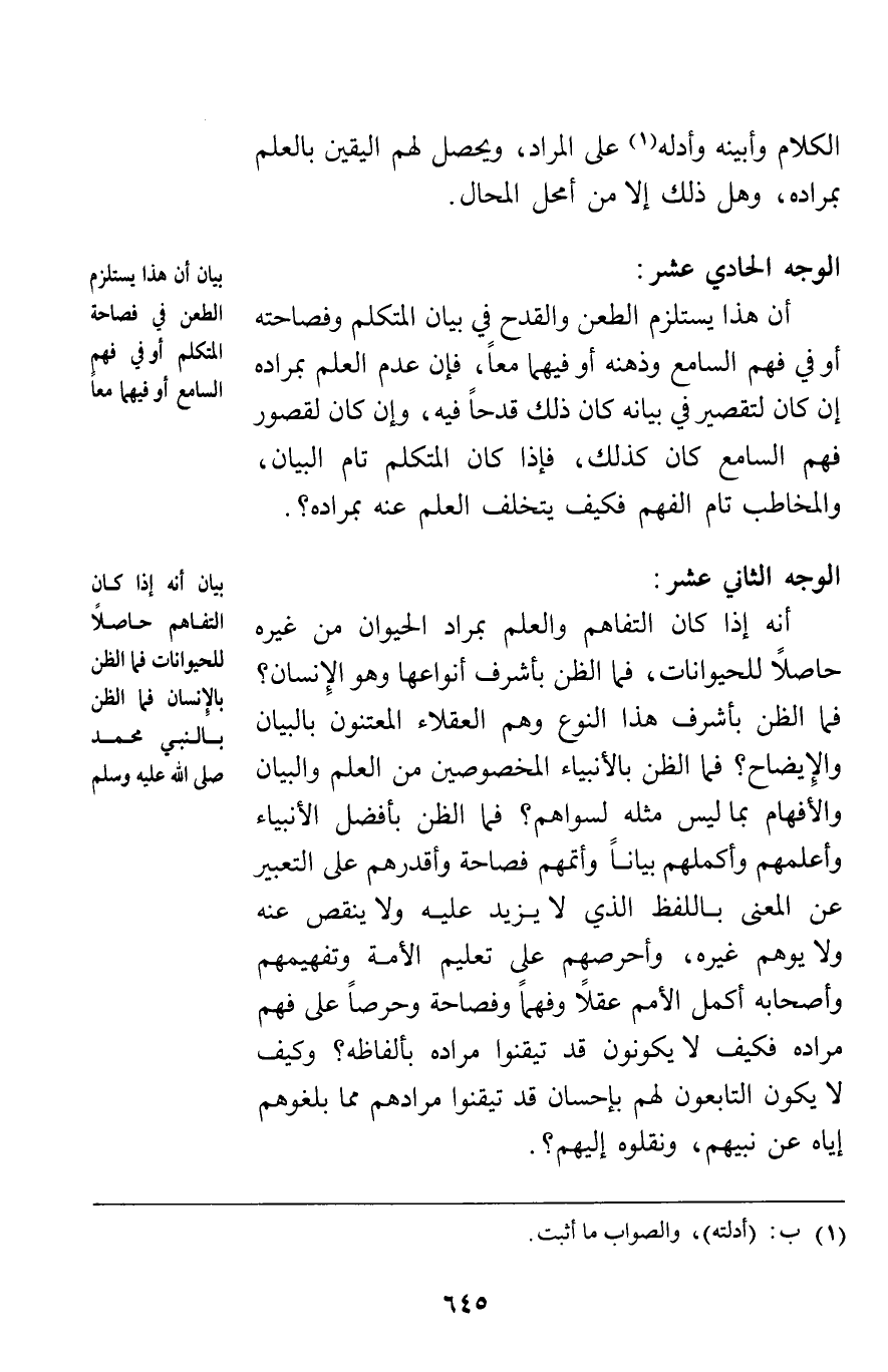 الوجه الثاني عشر: أنه إذا كان التفاهم والعلم بمراد الحيوان من غيره حاصلا للحيوانات فما الظن بأشرف أنواعها وهو الإنسان فما الظن بأشرف هذا النوع وهم العقلاء المعتنون بالبيان والإيضاح فما الظن بالأنبياء المخصوصين من العلم والبيان والأفهام بما ليس مثله لسواهم فما الظن بأفضل الأنبياء وأعلمهم وأكملهم بيانا وأتمهم فصاحة وأقدرهم على التعبير عن المعنى باللفظ الذي لا يزيد عليه ولا ينقص عنه ولا يوهم غيره وأحرصهم على تعليم الأمة وتفهيمهم وأصحابه أكمل الأمم عقلا وفهما وفصاحة وحرصا على فهم مراده فكيف لا يكونون قد تيقنوا مراده بألفاظه وكيف لا يكون التابعون لهم بإحسان قد تيقنوا مرادهم مما بلغوهم إياه عن نبيهم ونقلوه إليهم.