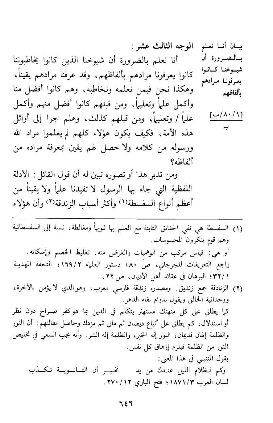 الوجه الثالث عشر: أنا نعلم بالضرورة أن شيوخنا الذين كانوا يخاطبوننا كانوا يعرفونا مرادهم بألفاظهم وقد عرفنا مرادهم يقينا وهكذا نحن فيمن نعلمه ونخاطبه وهم كانوا أفضل منا وأكمل علما وتعليما ومن قبلهم كانوا أفضل منهم وأكمل علما وتعليما ومن قبلهم كذلك وهلم جرا إلى أوائل هذه الأمة فكيف يكون هؤلاء كلهم لم يعلموا مراد الله ورسوله من كلامه ولا حصل لهم يقين بمعرفة مراده من ألفاظه؟ ومن تدبر هذا أو تصوره تبين له أن قول القائل الأدلة اللفظية التي جاء بها الرسول لا تفيدنا علما ولا يقينا من أعظم أنواع السفسطة وأكثر أسباب الزندقة وأن هؤلاء