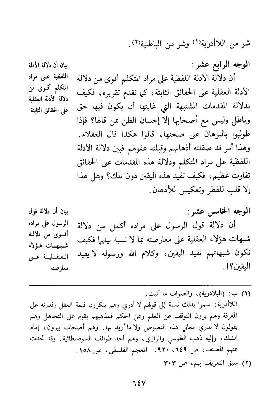 الوجه الخامس عشر: أن دلالة قول الرسول على مراده أكمل من دلالة شبهات هؤلاء العقلية على معارضته بما لا نسبة بينهما فكيف تكون شبهاتهم تفيد اليقين وكلام الله ورسوله لا يفيد اليقين