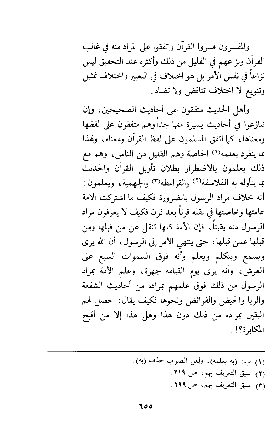 وأهل الحديث متفقون على أحاديث الصحيحين وإن تنازعوا في أحاديث يسيرة منها جدا وهم متفقون على لفظها ومعناها كما اتفق المسلمون على لفظ القرآن ومعناه وهذا مما ينفرد بعلمه الخاصة وهم القليل من الناس وهم مع ذلك يعلمون بالاضطرار بطلان تأويل القرآن والحديث بما يتأوله به الفلاسفة والقرامطة والجهمية ويعلمون أنه خلاف مراد الرسول بالضرورة فكيف بما اشتركت الأمة عامتها وخاصتها في نقله قرنا بعد قرن فكيف لا يعرفون مراد الرسول منه يقينا فإن الأمة كلها تنقل عن من قبلها ومن قبلها عمن قبلها حتى ينتهي الأمر إلى الرسول أن الله يرى ويسمع ويتكلم ويعلم وأنه فوق السموات السبع على العرش وأنه يرى يوم القيامة جهرة وعلم الأمة بمراد الرسول من ذلك فوق علمهم بمراده من أحاديث الشفعة والربا والحيض والفرائض ونحوها فكيف يقال حصل لهم اليقين بمراده من ذلك دون هذا وهل هذا إلا من أقبح المكابرة.
