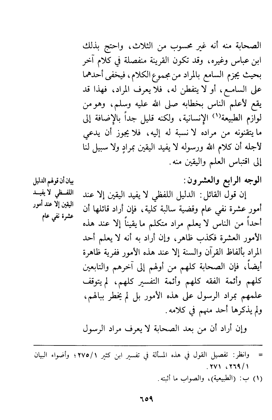 الوجه الرابع والعشرون: إن قول القائل الدليل اللفظي لا يفيد اليقين إلا عند أمور عشرة نفي عام وقضية سالبة كلية فإن أراد قائلها أن أحدا من الناس لا يعلم مراد متكلم ما يقينا إلا عند هذه الأمور العشرة فكذب ظاهر وإن أراد به أنه لا يعلم أحد المراد بألفاظ القرآن والسنة إلا عند هذه الأمور ففرية ظاهرة أيضا فإن الصحابة كلهم من أولهم إلى آخرهم والتابعين كلهم وأئمة الفقه كلهم وأئمة التفسير كلهم لم يتوقف علمهم بمراد الرسول على هذه الأمور بل لم يخطر ببالهم ولم يذكرها أحد منهم في كلامه.