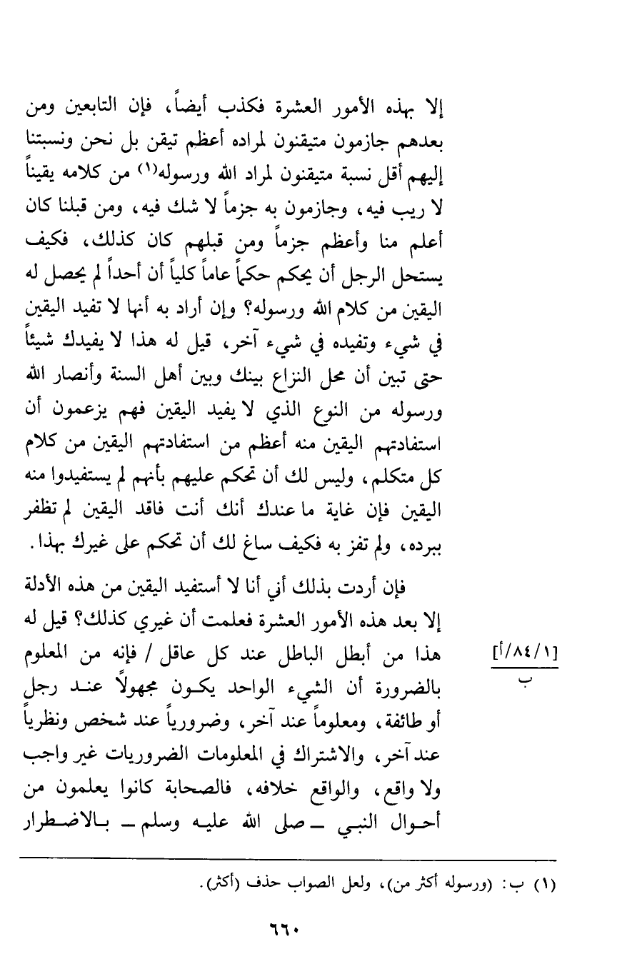 إلا بهذه الأمور العشرة فكذب أيضا فإن التابعين ومن بعدهم جازمون متيقنون لمراده أعظم تيقن بل نحن ونسبتنا إليهم أقل نسبة متيقنون لمراد الله ورسوله من كلامه يقينالا ريب فيه وجازمون به جزما لا شك فيه ومن قبلنا كان أعلم منا وأعظم جزما ومن قبلهم كان كذلك فكيف يستحل الرجل أن يحكم حكما عاما كليا أن أحدا لم يحصل له اليقين من كلام الله ورسوله وإن أراد به أنها لا تفيد اليقين في شيء وتفيده في شيءآخر قيل له هذا لا يفيدك شيئا حتى تبين أن محل النزاع بينك وبين أهل السنة وأنصار الله ورسوله من النوع الذي لا يفيد اليقين فهم يزعمون أن استفادتهم اليقين منه أعظم من استفادتهم اليقين من كلام كل متكلم وليس لك أن تحكم عليهم بأنهم لم يستفيدوا منه اليقين فإن غاية ما عندك أنك أنت فاقد اليقين لم تظفر ببرده ولم تفز به فكيف ساغ لك أن تحكم على غيرك بهذا. فإن أردت بذلك أني أنا لا أستفيد اليقين من هذه الأدلة إلا بعد هذه الأمور العشرة فعلمت أن غيري كذلك قيل له هذا من أبطل الباطل عند كل عاقل فإنه من المعلوم بالضرورة أن الشيء الواحد يكون مجهولا عند رجل أو طائفة ومعلوما عند آخر وضروريا عند شخص ونظريا عند آخر والاشتراك في المعلومات الضروريات غير واجب ولا واقع والواقع خلافه فالصحابة كانوا يعلمون من أحوال النبي بالاضطرار