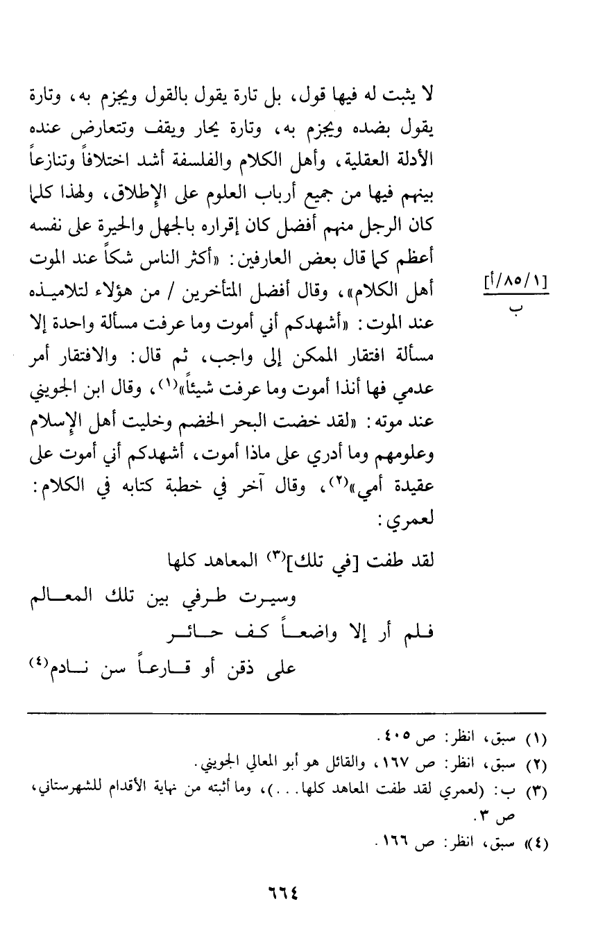 لا يثبت له فيها قول بل تارة يقول بالقول ويجزم به وتارة يقول بضده ويجزم به وتارة يحار ويقف وتتعارض عنده الأدلة العقلية وأهل الكلام والفلسفة أشد اختلافا وتنازعا بينهم فيها من جميع أرباب العلوم على الإطلاق ولهذا كلما كان الرجل منهم أفضل كان إقراره بالجهل والحيرة على نفسه أعظم كما قال بعض العارفين أكثر الناس شكا عند الموت أهل الكلام وقال أفضل المتأخرين من هؤلاء لتلاميذه عند الموت أشهدكم أني أموت وما عرفت مسألة واحدة إلا مسألة افتقار الممكن إلى واجب ثم قال والافتقار أمر عدمي فهاأنذا أموت وما عرفت شيئا وقال ابن الجويني عند موته لقد خضت البحر الخضم وخليت أهل الإسلام وعلومهم وما أدري على ماذا أموت أشهدكم أني أموت على عقيدة أمي وقال آخر في خطبة كتابه في الكلام لعمري: