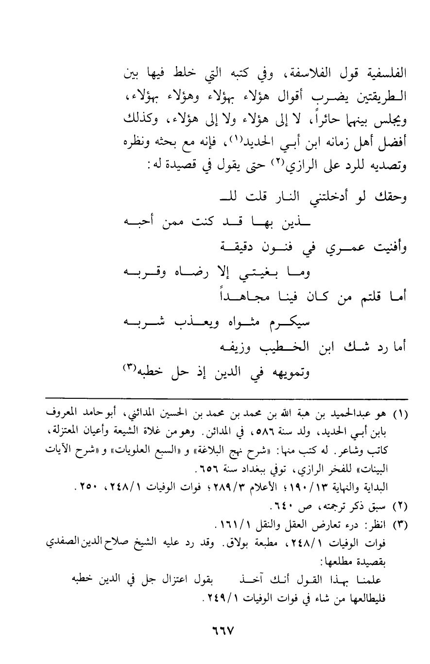 الفلسفية قول الفلاسفة وفي كتبه التي خلط فيها بين الطريقتين يضرب أقوال هؤلاء بهؤلاء وهؤلاء بهؤلاء ويجلس بينهما حائرا لا إلى هؤلاء ولا إلى هؤلاء وكذلك أفضل أهل زمانه ابن أبي الحديد فإنه مع بحثه ونظره وتصديه للرد على الرازي حتى يقول في قصيدة له:
