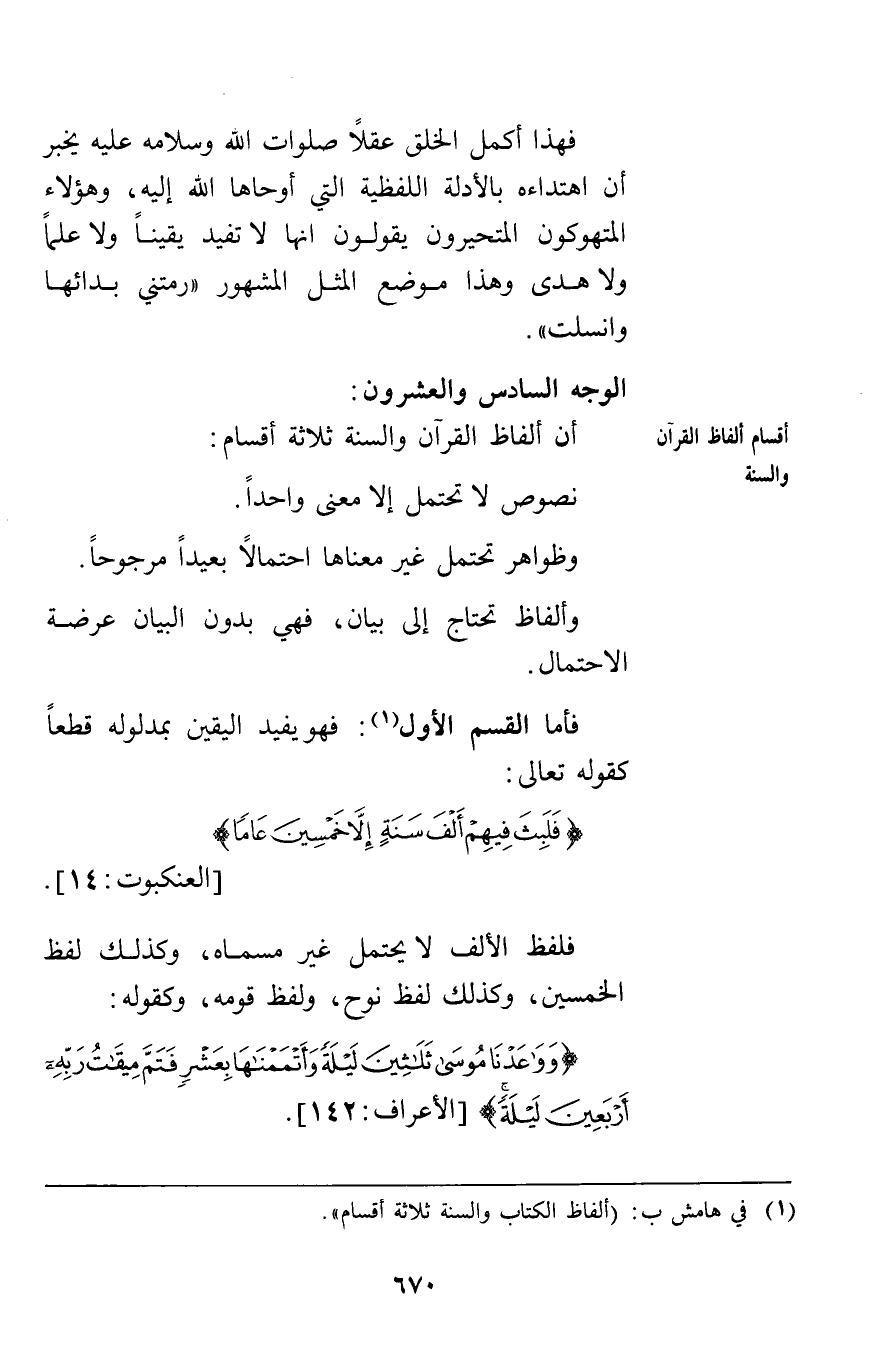 الوجه السادس والعشرون: أن ألفاظ القرآن والسنة ثلاثة أقسام نصوص لا تحتمل إلا معنى واحدا وظواهر تحتمل غير معناها احتمالا بعيدا مرجوحا وألفاظ تحتاج إلى بيان فهي بدون البيان عرضة الاحتمال.