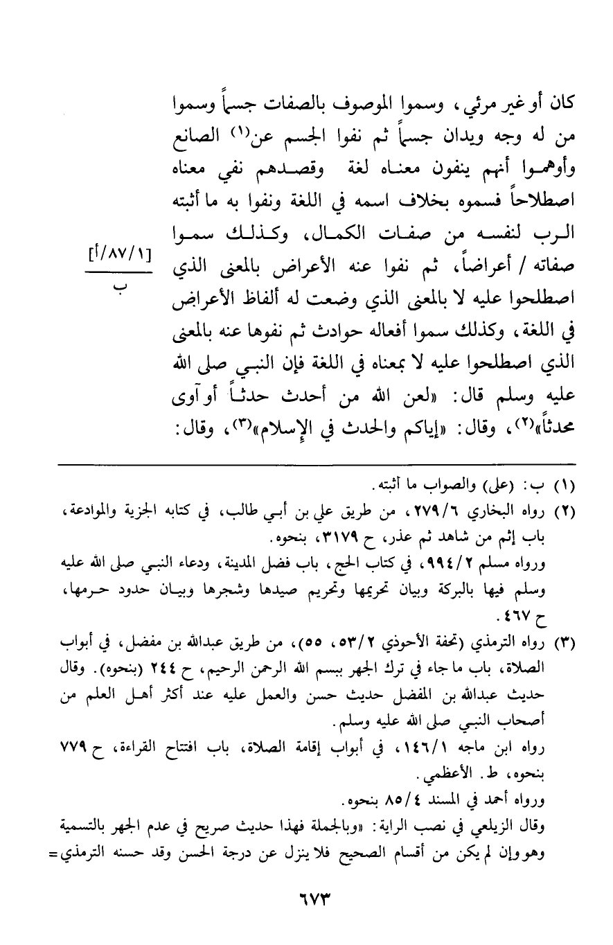 كان أو غير مرئي وسموا الموصوف بالصفات جسما وسموا من له وجه ويدان جسما ثم نفوا الجسم عن الصانع وأوهموا أنهم ينفون معناه لغة وقصدهم نفي معناه اصطلاحا فسموه بخلاف اسمه في اللغة ونفوا به ما أثبته الرب لنفسه من صفات الكمال وكذلك سموا صفاته أعراضا ثم نفوا عنه الأعراض بالمعنى الذي اصطلحوا عليه لا بالمعنى الذي وضعت له ألفاظ الأعراض في اللغة وكذلك سموا أفعاله حوادث ثم نفوها عنه بالمعنى الذي اصطلحوا عليه لا بمعناه في اللغة فإن النبي قال لعن الله من أحدث حدثا أو آوى محدثا وقال إياكم والحدث في الإسلام وقال: