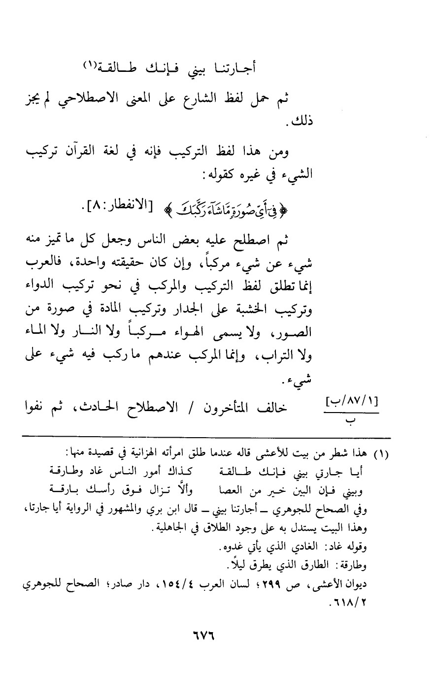 ثم حمل لفظ الشارع على المعنى الاصطلاحي لم يجز ذلك ومن هذا لفظ التركيب فإنه في لغة القرآن تركيب الشيء في غيره كقوله {فِي أَيِّ صُورَةٍ مَا شَاءَ رَكَّبَكَ} [الانفطار8] ثم اصطلح عليه بعض الناس وجعل كل ما تميز منه شيء عن شيء مركبا وإن كان حقيقته واحدة فالعرب إنما تطلق لفظ التركيب والمركب في نحو تركيب الدواء وتركيب الخشبة على الجدار وتركيب المادة في صورة من الصور ولا يسمى الهواء مركبا ولا النار ولا الماء ولا التراب وإنما المركب عندهم ما ركب فيه شيء على شيء.