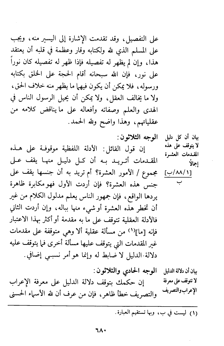 الوجه الثلاثون: إن قول القائل الأدلة اللفظية موقوفة على هذه المقدمات أتريد به أن كل دليل منها يقف على مجموع الأمور العشرة أم تريد به أن جنسها يقف على جنس هذه العشرة فإن أردت الأول فهو مكابرة ظاهرة يردها الواقع فإن جمهور الناس يعلم مدلول الكلام من غير أن تخطر هذه العشرة أو شيء منها بباله وإن أردت الثاني فالأدلة العقلية تتوقف على ما به مقدمة أو أكثر بهذا الاعتبار فإنه ما من مسألة عقلية إلا وهي متوقفة على مقدمات غير المقدمات التي يتوقف عليها مسألة أخرى فما يتوقف عليه دلالة الدليل لا ضابط له وإنما هو أمر نسبي إضافي.