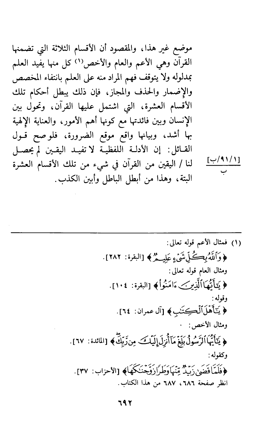 موضع غير هذا والمقصود أن الأقسام الثلاثة التي تضمنها القرآن وهي الأعم والعام والأخص كل منها يفيد العلم بمدلوله ولا يتوقف فهم المراد منه على العلم بانتفاء المخصص والإضمار والحذف والمجاز فإن ذلك يبطل أحكام تلك الأقسام العشرة التي اشتمل عليها القرآن وتحول بين الإنسان وبين فائدتها مع كونها أهم الأمور والعناية الإلهية بها أشد وبيانها واقع موقع الضرورة فلو صح قول القائل إن الأدلة اللفظية لا تفيد اليقين لم يحصل لنا اليقين من القرآن في شيء من تلك الأقسام العشرة البتة وهذا من أبطل الباطل وأبين الكذب.