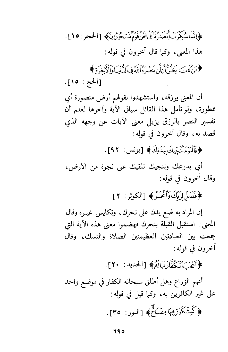 {إِنَّمَا سُكِّرَتْ أَبْصَارُنَا بَلْ نَحْنُ قَوْمٌ مَسْحُورُونَ} [الحجر15] هذا المعنى وكما قال آخرون في قوله: {مَنْ كَانَ يَظُنُّ أَنْ لَنْ يَنْصُرَهُ اللَّهُ فِي الدُّنْيَا وَالْآخِرَةِ} [الحج15] أن المعنى يرزقه واستشهدوا بقولهم أرض منصورة أي ممطورة ولو تأمل هذا القائل سياق الآية وآخرها لعلم أن تفسير النصر بالرزق يزيل معنى الآيات عن وجهه الذي قصد به وقال آخرون في قوله: {فَالْيَوْمَ نُنَجِّيكَ بِبَدَنِكَ} [يونس92] أي بدرعك وننجيك نلقيك على نجوة من الأرض وقال آخرون في قوله: {فَصَلِّ لِرَبِّكَ وَانْحَرْ} [الكوثر2] إن المراد به ضع يدك على نحرك وتكايس غيره وقال المعنى استقبل القبلة بنحرك فهضموا معنى هذه الآية التي جمعت بين العبادتين العظيمتين الصلاةوالنسك وقال آخرون في قوله: {أَعْجَبَ الْكُفَّارَ نَبَاتُهُ} [الحديد20] إنهم الزراع وهل أطلق سبحانه الكفار في موضع واحد على غير الكافرين به وكما قيل في قوله: {نُورِهِ كَمِشْكَاةٍ فِيهَا مِصْبَاحٌ} [النور35]