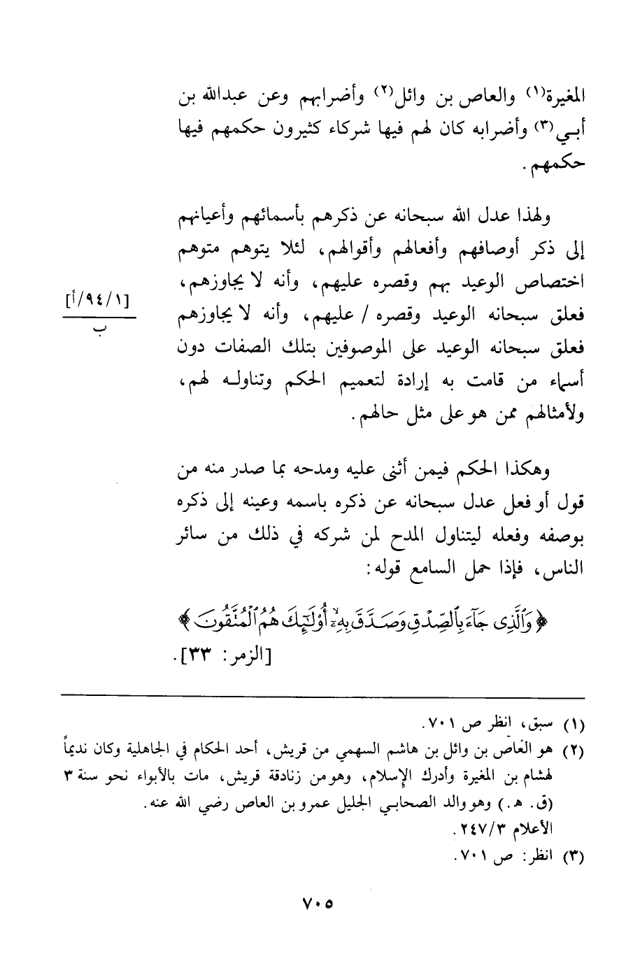 ولهذا عدل الله سبحانه عن ذكرهم بأسمائهم وأعيانهم إلى ذكر أوصافهم وأفعالهم وأقوالبهم لئلا يتوهم متوهم اختصاص الوعيد بهم وقصره عليهم وأنه لا يجاوزهم فعلق سبحانه الوعيد وقصره عليهم وأنه لا يجاوزهم فعلق سبحانه الوعيد على الموصوفين بتلك الصفات دون أسماء من قامت به إرادة لتعميم الحكم وتناوله لهم ولأمثالهم ممن هو على مثل حالهم.