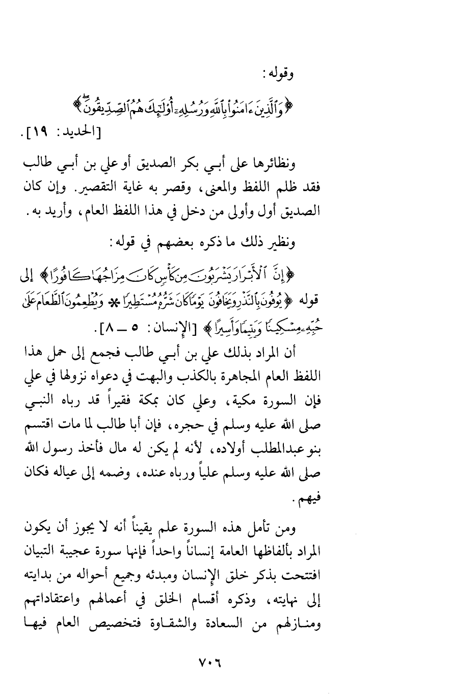 وقوله {وَالَّذِينَ آمَنُوا بِاللَّهِ وَرُسُلِهِ أُولَئِكَ هُمُ الصِّدِّيقُونَ} [الحديد19] ونظائرها على أبي بكر الصديق أو علي بن أبي طالب فقد ظلم اللفظ والمعنى وقصر به غاية التقصير وإن كان الصديق أول وأولى من دخل في هذا اللفظ العام وأريد به ونظير ذلك ما ذكره بعضهم في قوله {إِنَّ الأَبْرَارَ يَشْرَبُونَ مِنْ كَأْسٍ كَانَ مِزَاجُهَا كَافُوراً} إلى قوله {يُوفُونَ بِالنَّذْرِ وَيَخَافُونَ يَوْماً كَانَ شَرُّهُ مُسْتَطِيراً وَيُطْعِمُونَ الطَّعَامَ عَلَى حُبِّهِ مِسْكِيناً وَيَتِيماً وَأَسِيراً} [الإنسان 5 - 8] إن المراد بذلك علي بن أبي طالب فجمع إلى حمل هذا اللفظ العام المجاهرة بالكذب والبهت في دعواه نزولها في علي فإن السورة مكية وعلي كان بمكة فقيرا قد رباه النبي في حجره فإن أبا طالب لما مات اقتسم بنو عبد المطلب أولاده لأنه لم يكن له مال فأخذ رسول الله صلى الله عليه وسلم عليا ورباه عنده وضمه إلى عياله فكان فيهم.