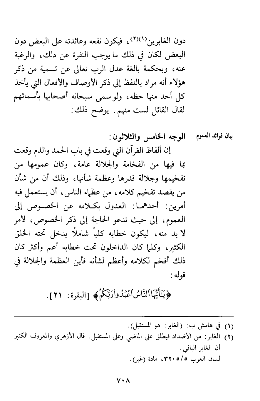 الوجه الخامس والثلاثون إن ألفاظ القرآن التي وقعت في باب الحمد والذم وقعت بما فيها من الفخامة والجلالة عامة وكان عمومها من تفخيمها وجلالة قدرها وعظمة شأنها وذلك أن من شأن من يقصد تفخيم كلامه من عظماء الناس أن يستعمل فيه أمرين أحدهما العدول بكلامه عن الخصوص إلى العموم إلى حيث تدعو الحاجة إلى ذكر الخصوص لأمر لا بد منه ليكون خطابه كليا شاملا يدخل تحته الخلق الكثير وكلما كان الداخلون تحت خطابه أعم واكثر كان ذلك أفخم لكلامه وأعظم لشأنه فأين العظمة والجلالة في قوله {يَا أَيُّهَا النَّاسُ اعْبُدُوا رَبَّكُمُ} [البقرة 21]