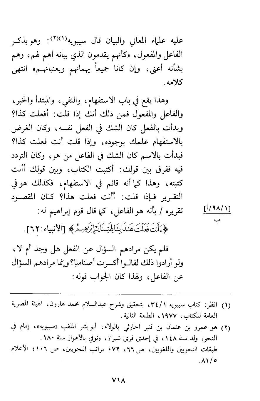 وهذا يقع في باب الاستفهام والنفي والمبتدأ والخبر والفاعل والمفعول فمن ذلك أنك إذا قلت أفعلت كذا وبدأت بالفعل كان الشك في الفعل نفسه وكان الغرض بالاستفهام علمك بوجوده وإذا قلت أنت فعلت كذا فبدأت بالاسم كان الشك في الفاعل من هو وكان التردد فيه ففرق بين قولك أكتبت الكتاب وبين قولك أأنت كتبته وهذا كما أنه قائم في الاستفهام فكذلك هو في التقرير فإذا قلت أنت فعل هذا? كان المقصود تقريره بأنه هو الفاعل كما قال قوم إبراهيم له {أَأَنْتَ فَعَلْتَ هَذَا بِآلِهَتِنَا يَا إِبْرَاهِيمُ} [الأنبياء62] فلم يكن مرادهم السؤال عن الفعل هل وجد أم لا ولو أرادوا ذلك لقالوا أكسرت أصنامنا? وإنما مرادهم السؤال عن الفاعل ولهذا كان الجواب قوله: