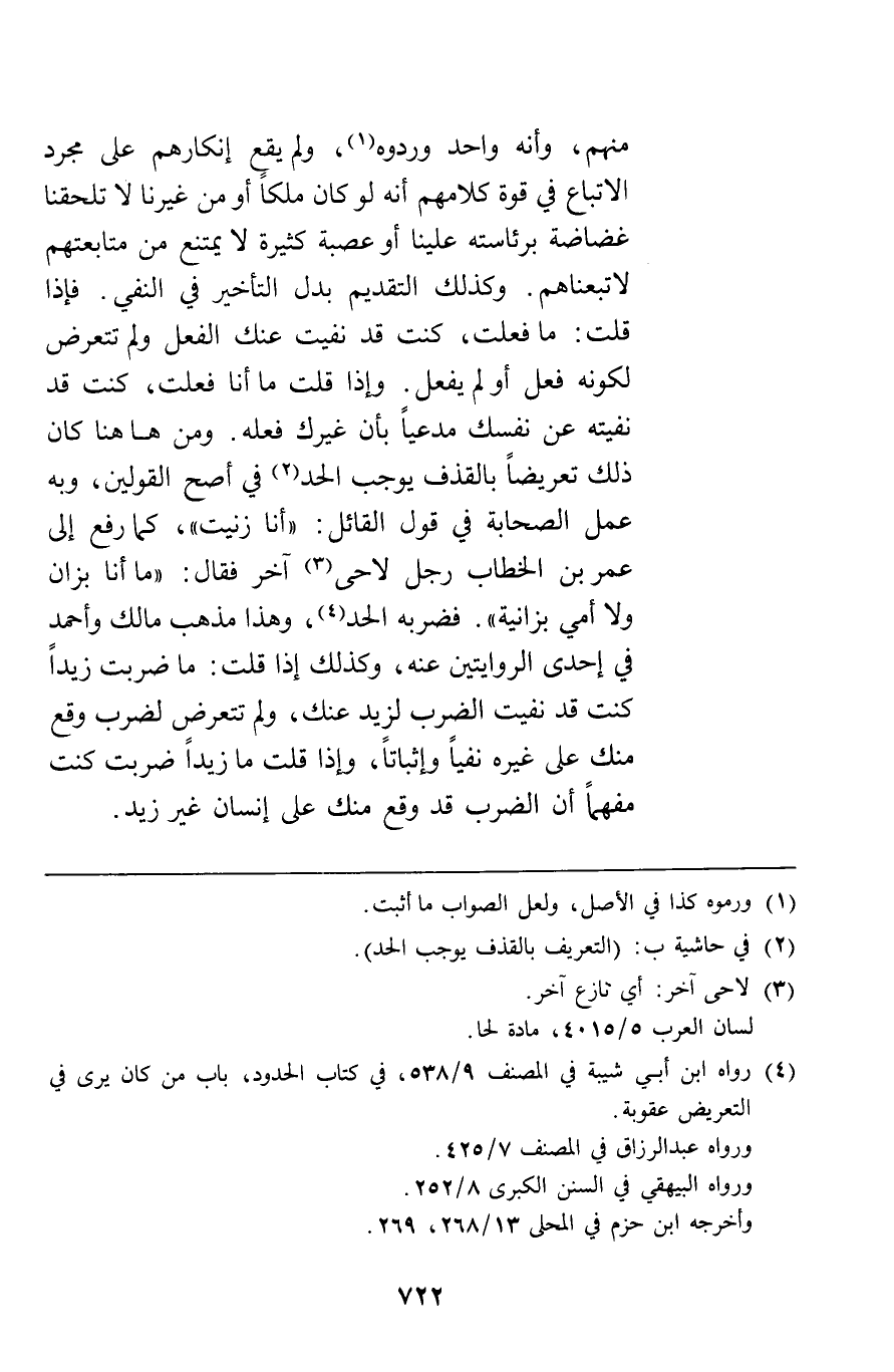 منهم وأنه واحد وردوه ولم يقع إنكارهم على مجرد الاتباع في قوة كلامهم أنه لو كان ملكا أو من غيرنا لا تلحقنا غضاضة برئاسته علينا أو عصبة كثيرة لا يمتنع من متابعتهم لاتبعناهم وكذلك التقديم بدل التأخير في النفي فإذا قلت ما فعلت كنت قد نفيت عنك الفعل ولم تتعرض لكونه فعل أو لم يفعل وإذا قلت ما أنا فعلت كنت قد نفيته عن نفسك مدعيا بأن غيرك فعله ومن ها هنا كان ذلك تعريضا بالقذف يوجب الحد في أصح القولين وبه عمل الصحابة في قول القائل أنا زنيت كما رفع إلى عمر بن الخطاب رجل لاحى آخر فقال ما أنا بزان ولا أمي بزانية فضربه الحد وهذا مذهب مالك وأحمد في إحدى الروايتين عنه وكذلك إذا قلت ما ضربت زيدا كنت قد نفيت الضرب لزيد عنك ولم تتعرض لضرب وقع منك على غيره نفيا وإثباتا وإذا قلت ما زيدا ضربت كنت مفهما أن الضرب قد وقع منك على إنسان غير زيد.