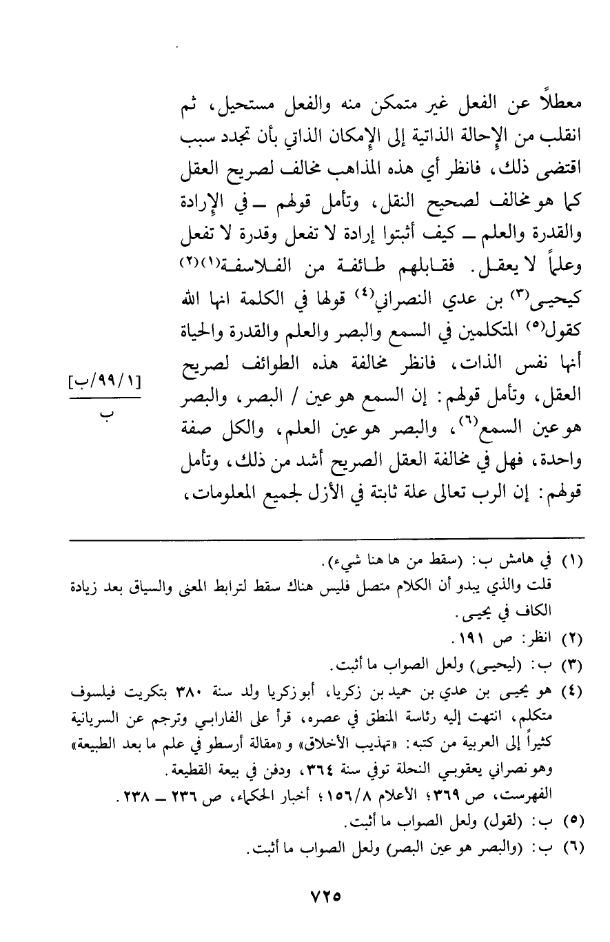 معطلاعن الفعل غير متمكن منه والفعل مستحيل ثم انقلب من اإلإحالة الذاتية إلى الإمكان الذاتي بأن تجدد سبب اقتضى ذلك فانظر أي هذه المذاهب مخالف لصريح العقل كما هو مخالف لصحيح النقل وتأمل قولهم في الإرادة والقدرة والعلم كيف أثبتوا إرادة لا تفعل وقدرة لا تفعل وعلما لا يعقل فقابلهم طائفة من الفلاسفة كيحيى بن عدي النصراني قولها في الكلمة إنها الله كقول المتكلمين في السمع والبصر والعلم والقدرة والحياة أنها نفس الذات فانظر مخالفة هذه الطوائف لصريح العقل وتأمل قولهم إن السمع هو عين البصر والبصر هو عين السمع والبصر هو عين العلم والكل صفة واحدة فهل في مخالفة العقل الصريح أشد من ذلك وتأمل قولهم إن الرب تعالى علة ثابتة في الأزل لجميع المعلولات.