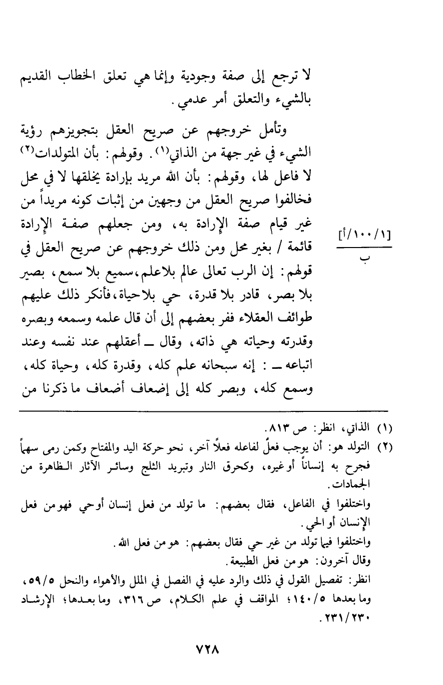 وتأمل خروجهم عن صريح العقل بتجويزهم رؤية الشيء في غير جهة من الذاتي وقولهم بأن المتولدات لا فاعل لها وقولهم بأن الله مريد بإرادة يخلقها لا في محل فخالفوا صريح العقل من وجهين من إثبات كونه مريدا من غير قيام صفة الإرادة به ومن جعلهم صفة الإرادة قائمة بغير محل ومن ذلك خروجهم عن صريح العقل في قولهم إن الرب تعالى عالم بلا علم سميع بلا سمع بصير بلا بصر قادر بلا قدرة حي بلا حياة فأنكر ذلك عليهم طوائف العقلاء ففر بعضهم إلى أن قال علمه وسمعه وبصره وقدرته وحياته هي ذاته وقال أعقلهم عند نفسه وعند أتباعه إنه سبحانه علم كله وقدرة كله وحياة كله وسمع كله وبصر كله إلى إضعاف أضاف ما ذكرنا من