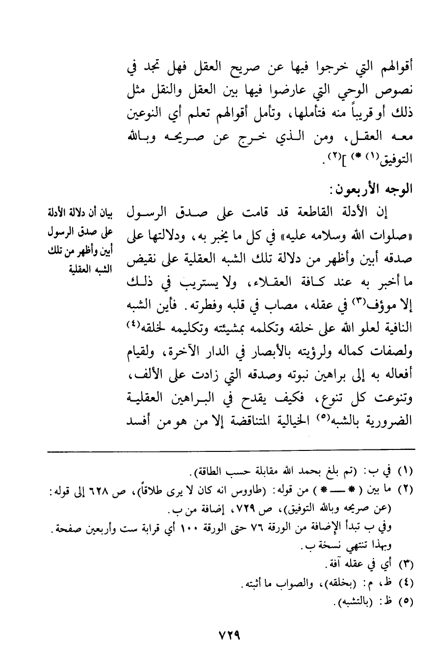 الوجه الأربعون: إن الأدلة القاطعة قد قامت على صدق الرسول في كل ما يخبر به ودلالتها على صدقه أبين وأظهر من دلالة تلك الشبه العقلية على نقيض ما أخبر به عند كافة العقلاء ولا يستريب في ذلك إلا موؤف في عقله مصاب في قلبه وفطرته فأين الشبه النافية لعلو الله على خلقه وتكلمه بمشيئته وتكليمه لخلقه ولصفات كماله ولرؤيته بالأبصار في الدار الآخرة ولقيام أفعاله به إلى براهين نبوته وصدقه التي زادت على الألف وتنوعت كل تنوع فكيف يقدح في البراهين العقلية الضرورية بالشبه الخيالية المتناقضة إلا من هو من أفسد