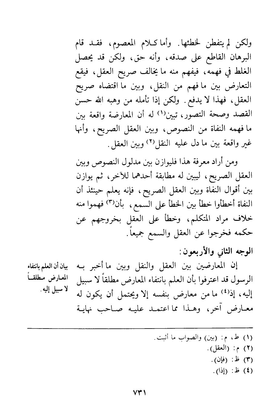 ولكن لم يتفطن لخطئها وأما كلام المعصوم فقد قام البرهان القاطع على صدقه وأنه حق ولكن قد يحصل الغلط في فهمه فيفهم منه ما يخالف صريح العقل فيقع التعارض بين ما فهم من النقل وبين ما اقتضاه صريح العقل فهذا لا يدفع ولكن إذا تأمله من وهبه الله حسن القصد وصحة التصور تبين له أن المعارضة واقعة بين ما فهمه النفاة من النصوص وبين العقل الصريح وأنها غير واقعة بين ما دل عليه النقل وبين العقل.