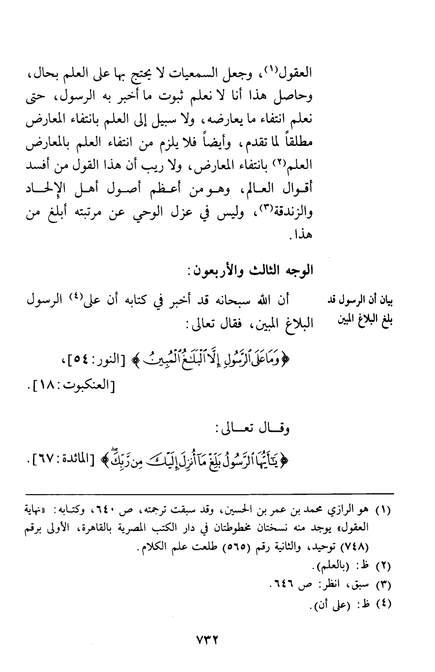 الوجه الثالث والأربعون: أن الله سبحانه قد أخبر في كتابه أن على الرسول البلاغ المبين فقال تعالى {وَمَا عَلَى الرَّسُولِ إِلاَّ الْبَلاغُ الْمُبِينُ} [النور54] , [العنكبوت18] وقال تعالى {يَا أَيُّهَا الرَّسُولُ بَلِّغْ مَا أُنْزِلَ إِلَيْكَ مِنْ رَبِّكَ} [المائدة67]