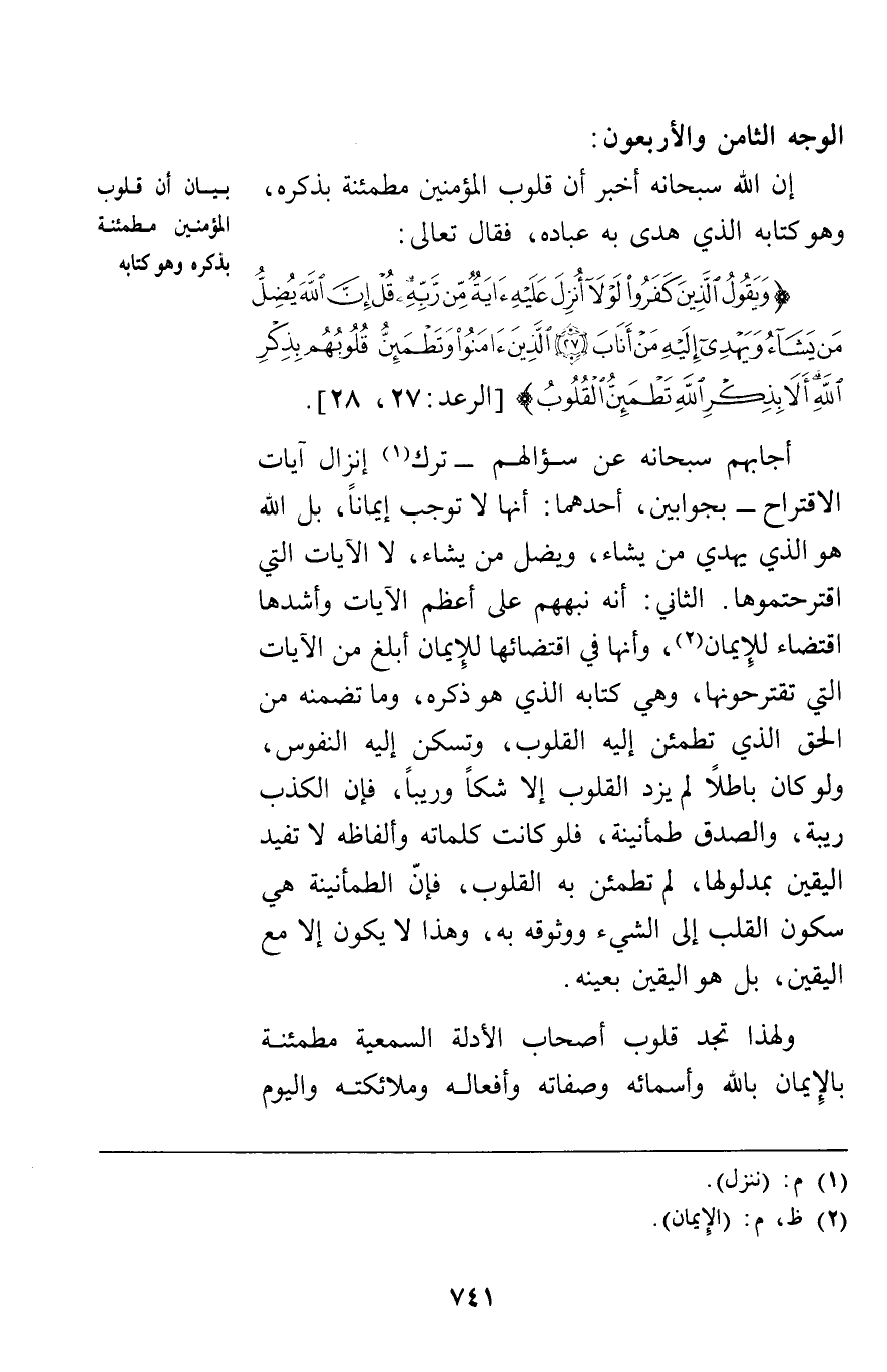 الوجه الثامن والأربعون: إن الله سبحانه أخبر أن قلوب المؤمنين مطمئنة بذكره وهو كتابه الذي هدى به عباده فقال تعالى: {وَيَقُولُ الَّذِينَ كَفَرُوا لَوْلا أُنْزِلَ عَلَيْهِ آيَةٌ مِنْ رَبِّهِ قُلْ إِنَّ اللَّهَ يُضِلُّ مَنْ يَشَاءُ وَيَهْدِي إِلَيْهِ مَنْ أَنَابَ الَّذِينَ آمَنُوا وَتَطْمَئِنُّ قُلُوبُهُمْ بِذِكْرِ اللَّهِ أَلا بِذِكْرِ اللَّهِ تَطْمَئِنُّ الْقُلُوبُ} [الرعد28 , 27] أجابهم سبحانه عن سؤالهم ترك إنزال آيات الاقتراح بجوابين: