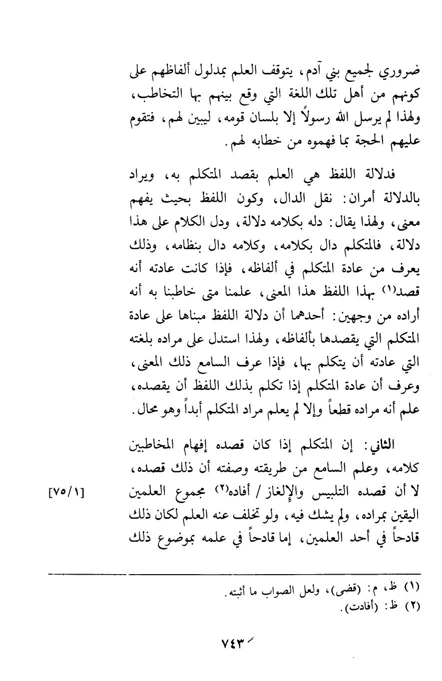 الثاني: إن المتكلم إذا كان قصده إفهام المخاطبين كلامه وعلم السامع من طريقته وصفته أن ذلك قصده لا أن قصده التلبيس والإلغاز أفاده مجموع العلمين اليقين بمراده ولم يشك فيه ولو تخلف عنه العلم لكان ذلك قادحا في أحد العلمين إما قادحا في علمه بموضوع ذلك
