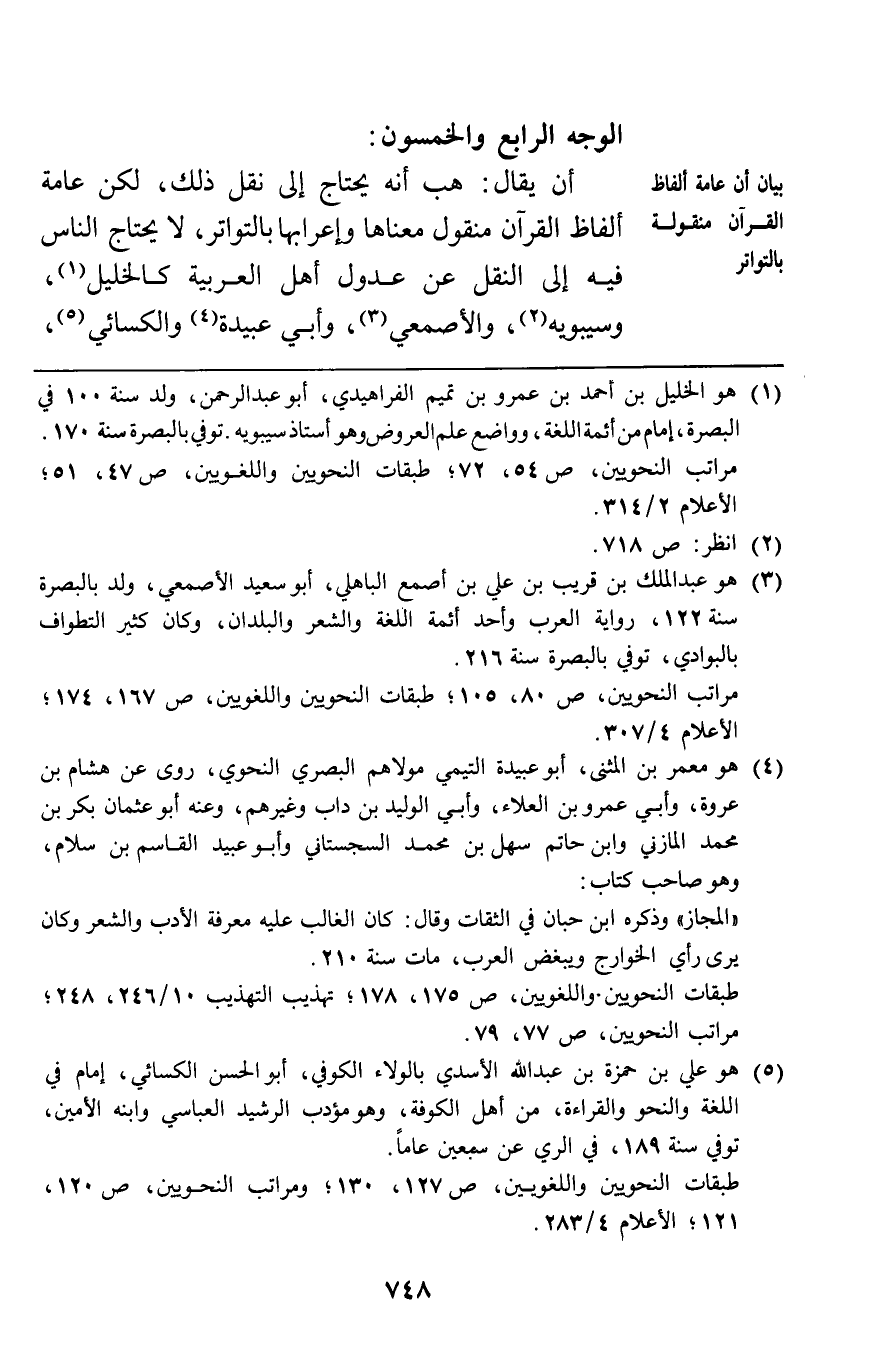 الوجه الرابع والخمسون: أن يقال هب أنه يحتاج إلى نقل ذلك لكن عامة ألفاظ القرآن منقول معناها وإعرابها بالتواتر لا يحتاج الناس فيه إلى النقل عن عدول أهل العربية كالخليل وسيبويه والأصمعي وأبي عبيدة والكسائي