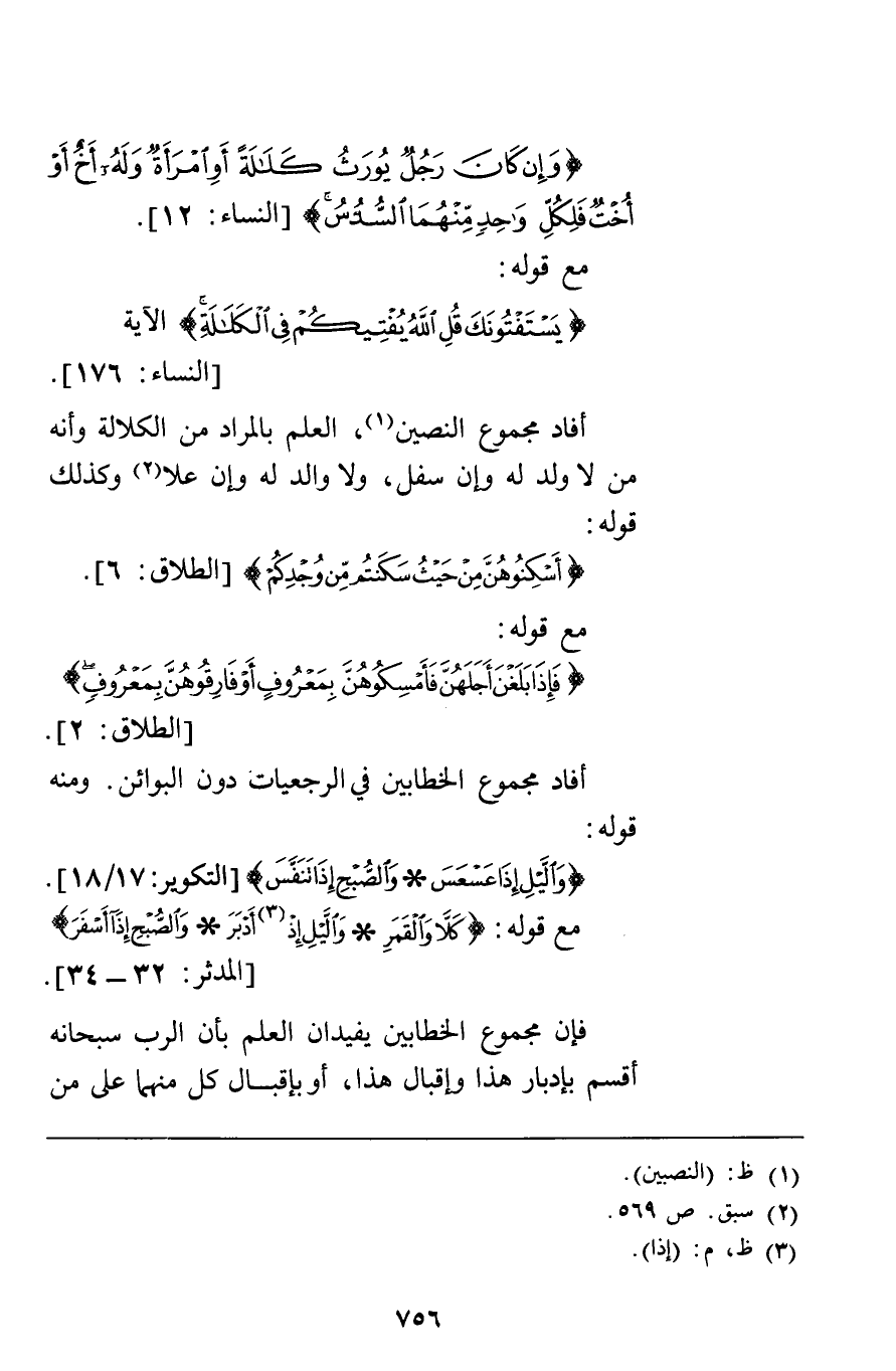 {وَإِنْ كَانَ رَجُلٌ يُورَثُ كَلالَةً أَوِ امْرَأَةٌ وَلَهُ أَخٌ أَوْ أُخْتٌ فَلِكُلِّ وَاحِدٍ مِنْهُمَا السُّدُسُ} [النساء12] مع قوله {يَسْتَفْتُونَكَ قُلِ اللَّهُ يُفْتِيكُمْ فِي الْكَلالَةِ} الآية [النساء176] أفاد مجموع النصين العلم بالمراد من الكلالة وأنه من لا ولد له وإن سفل ولا والد له وإن علا وكذلك قوله: {أَسْكِنُوهُنَّ مِنْ حَيْثُ سَكَنْتُمْ مِنْ وُجْدِكُمْ} [الطلاق6] مع قوله {فَإِذَا بَلَغْنَ أَجَلَهُنَّ فَأَمْسِكُوهُنَّ بِمَعْرُوفٍ أَوْ فَارِقُوهُنَّ بِمَعْرُوفٍ} [الطلاق2] أفاد مجموع الخطابين في الرجعيات دون البوائن ومنه قوله {وَاللَّيْلِ إِذَا عَسْعَسَ وَالصُّبْحِ إِذَا تَنَفَّسَ} [التكوير17/18] مع قوله {كَلاَّ وَالْقَمَرِ وَاللَّيْلِ إِذْ أَدْبَرَ وَالصُّبْحِ إِذَا أَسْفَرَ} [المدثر34-32] فإن مجموع الخطابين يفيدان العلم بأن الرب سبحانه أقسم بإدبار هذا وإقبال هذا أو بإقبال كل منهما على من
