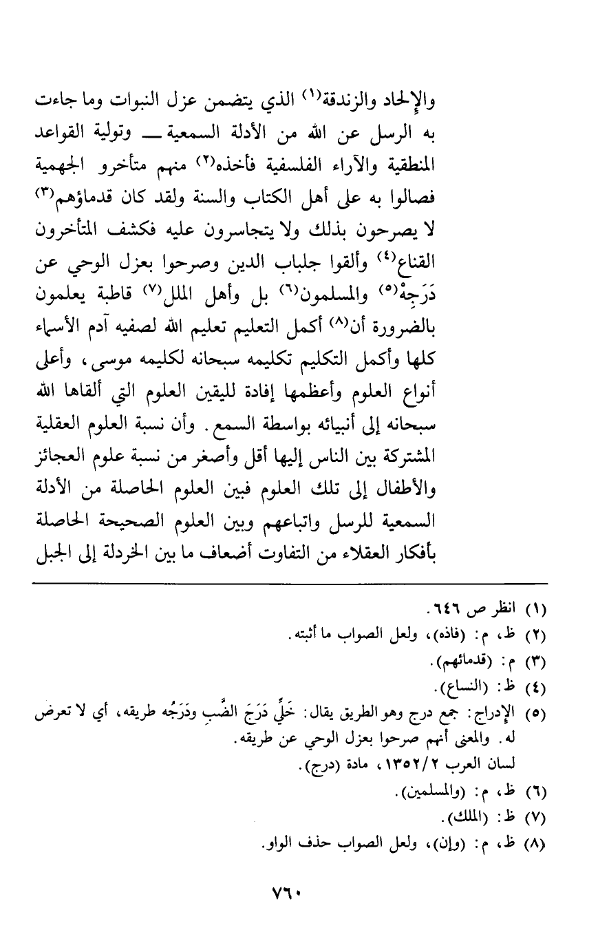 والإلحاد والزندقة الذي يتضمن عزل النبوات وما جاءت به الرسل عن الله من الأدلة السمعية وتولية القواعد المنطقية والآراء الفلسفية فأخذه منهم متأخرو الجهمية فصالوا به على أهل الكتاب والسنة ولقد كان قدماؤهم لا يصرحون بذلك ولا يتجاسرون عليه فكشف المتأخرون القناع وألقوا جلباب الدين وصرحوا بعزل الوحي عن درجه والمسلمون بل وأهل الملل قاطبة يعلمون بالضرورة أن أكمل التعليم تعليم الله لصفيه آدم الأسماء كلها وأكمل التكليم تكليمه سبحانه لكليمه موسى وأعلى أنواع العلوم وأعظمها إفادة لليقين العلوم التي ألقاها الله سبحانه إلى أنبيائه بواسطة السمع وأن نسبة العلوم العقلية المشتركة بين الناس إليها أقل وأصغر من نسبة علوم العجائز والأطفال إلى تلك العلوم فبين العلوم الحاصلة من الأدلة السمعية للرسل وأتباعهم وبين العلوم الصحيحة الحاصلة بأفكار العقلاء من التفاوت أضعاف ما بين الخردلة إلى الجبل