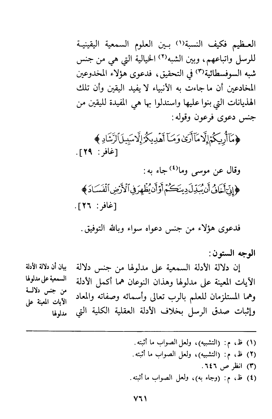 العظيم فكيف النسبة بين العلوم السمعية اليقينية للرسل وأتباعهم وبين الشبه الخيالية التي هي من جنس شبه السوفسطائية في التحقيق فدعوى هؤلاء المخدوعين المخادعين أن ما جاءت به الأنبياء لا يفيد اليقين وأن تلك الهذيانات التي بنوا عليها واستدلوا بها هي المفيدة لليقين من جنس دعوى فرعون وقوله: {مَا أُرِيكُمْ إِلاَّ مَا أَرَى وَمَا أَهْدِيكُمْ إِلاَّ سَبِيلَ الرَّشَادِ} [غافر29] وقال عن موسى وما جاء به {إِنِّي أَخَافُ أَنْ يُبَدِّلَ دِينَكُمْ أَوْ أَنْ يُظْهِرَ فِي الأَرْضِ الْفَسَادَ} [غافر26] فدعوى هؤلاء من جنس دعواه سواء وبالله التوفيق.