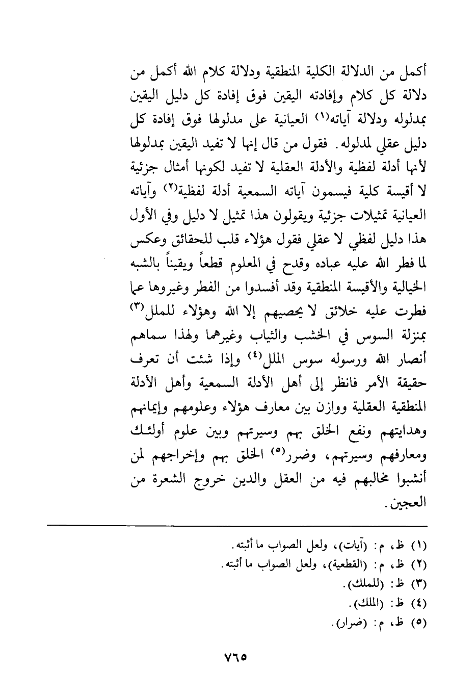 أكمل من الدلالة الكلية المنطقية ودلالة كلام الله أكمل من دلالة كل كلام وإفادته اليقين فوق إفادة كل دليل اليقين بمدلوله ودلالة آياته العيانية على مدلولها فوق إفادة كل دليل عقلي لمدلوله فقول من قال إنها لا تفيد اليقين بمكدلولها لأنها أدلة لفظية والأدلة العقلية لا تفيد لكونها أمثالا جزئية لا أقيسة كلية فيسمون آياته السمعية أدلة لفظية وآياته العيانية تمثيلات جزئية ويقولون هذا تمثيل لا دليل وفي الأول هذا دليل لفظي لا عقلي فقول هؤلاء قلب للحقائق وعكس لما فطر الله عليه عباده وقدح في المعلوم قطعا ويقينا بالشبه الخيالية والأقيسة المنطقية وقد أفسدوا من الفطر وغيروها عما فطرت عليه خلائق لا يحصيهم إلا الله وهؤلاء للملل بمنزل السوس في الخشب والثياب وغيرهما ولهذا سماهم أنصار الله ورسوله سوس الملل وإذا شئت أن تعرف حقيقة الأمر فانظر إلى أهل الأدلة السمعية وأهل الأدلة المنطقية العقلية ووازن بين معارف هؤلاء وعلومهم وإيمانهم وهدايتهم ونفع الخلق بهم وسيرتهم وبين علوم أولئك ومعارفهم وسيرتهم وضرر الخلق بهم وإخراجهم لمن أنشبوا مخالبهم فيه من العقل والدين خروج الشعرة من العجين.